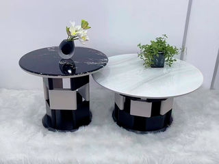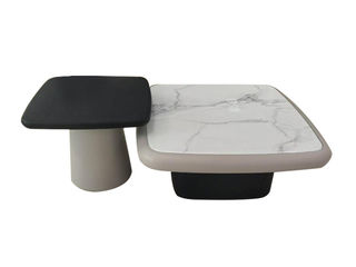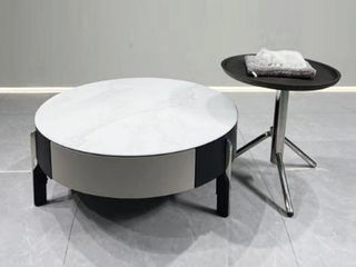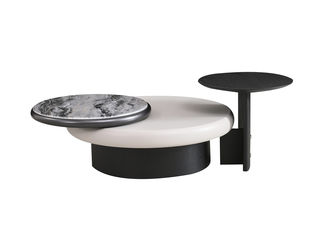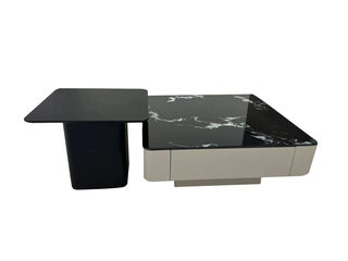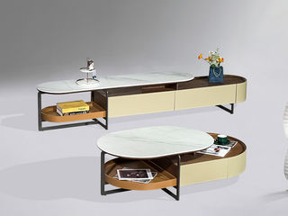 小红书系列 现代 茶几:胡桃木皮柜身+马鞍皮双抽+不锈钢底架+罗曼蒂克石面 边几:马鞍皮面板+不锈钢底架 0.9米组合茶几