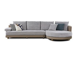 梵纳意简 极简 棉麻布+马鞍皮+多层实木板+实木框架+高回弹海绵+不锈钢五金+羽绒 右转角3.75米沙发 康纳利圆妃
