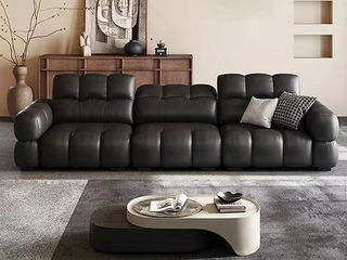 非凡工艺 现代简约 接触面头层黄牛皮+仿皮 E1级夹板+松木框架 无粉海绵 靠包、扶手包有赛羽绒+公仔棉填充 样色 直排2.4米三人位 皮艺沙发