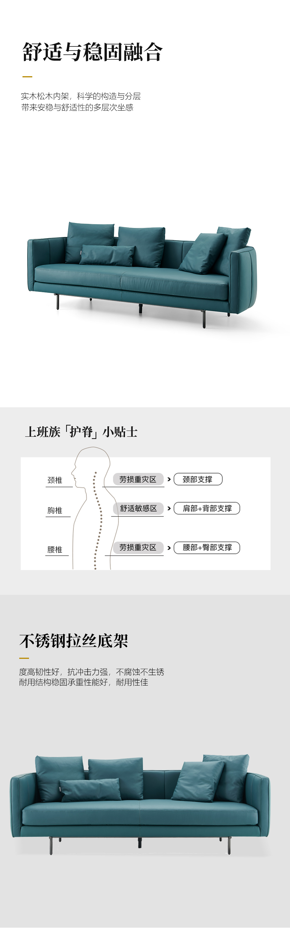 Milos米洛斯 极简 全超纤皮(A+布)+高回弹海绵+羽绒+实木松木内架+不锈钢拉丝脚 皮艺2.35米沙发 三人位