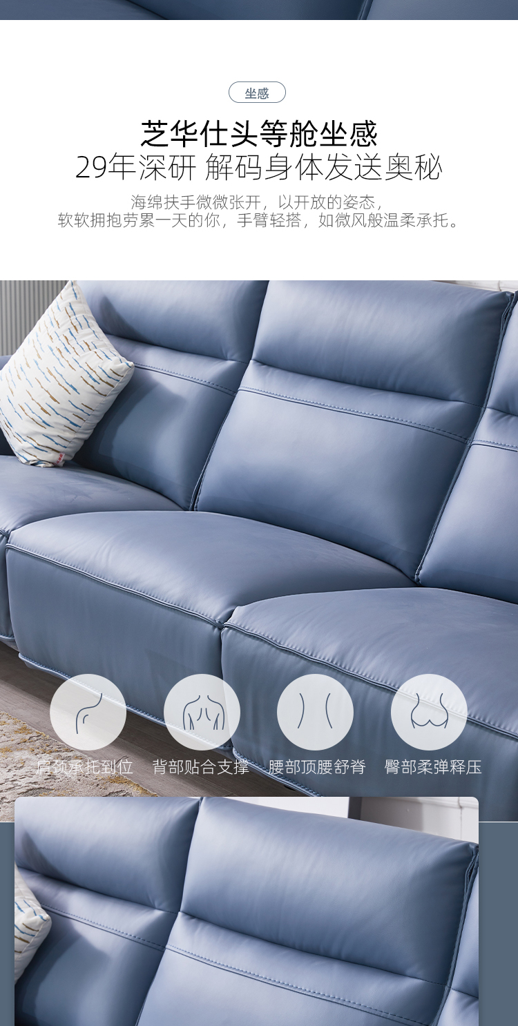 芝华仕 现代简约 接触面进口头层奶牛皮+PVC+合金钢架+进口实木+多层实木板+合金脚+太空绵+高回弹海绵 三人位【三电机】皮艺2.76米沙发¥13001