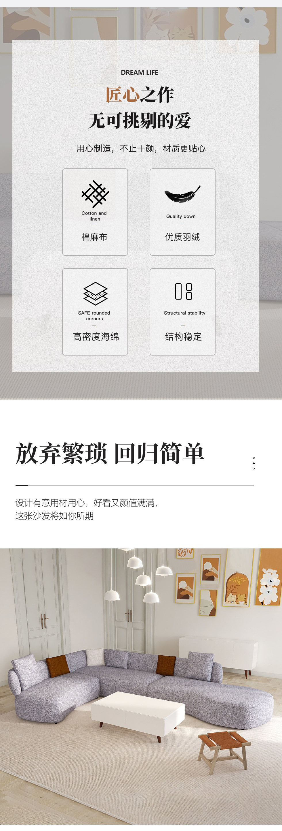 缔造 极简 优质棉麻布+羽绒+高密度海棉+金属矮脚 布艺转角沙发(右2+左角+左长贵)