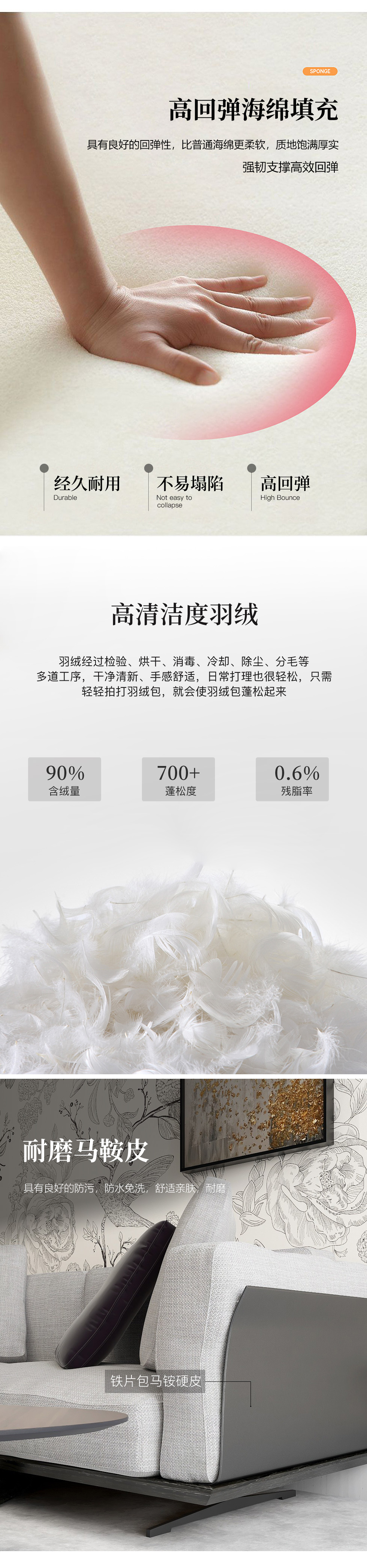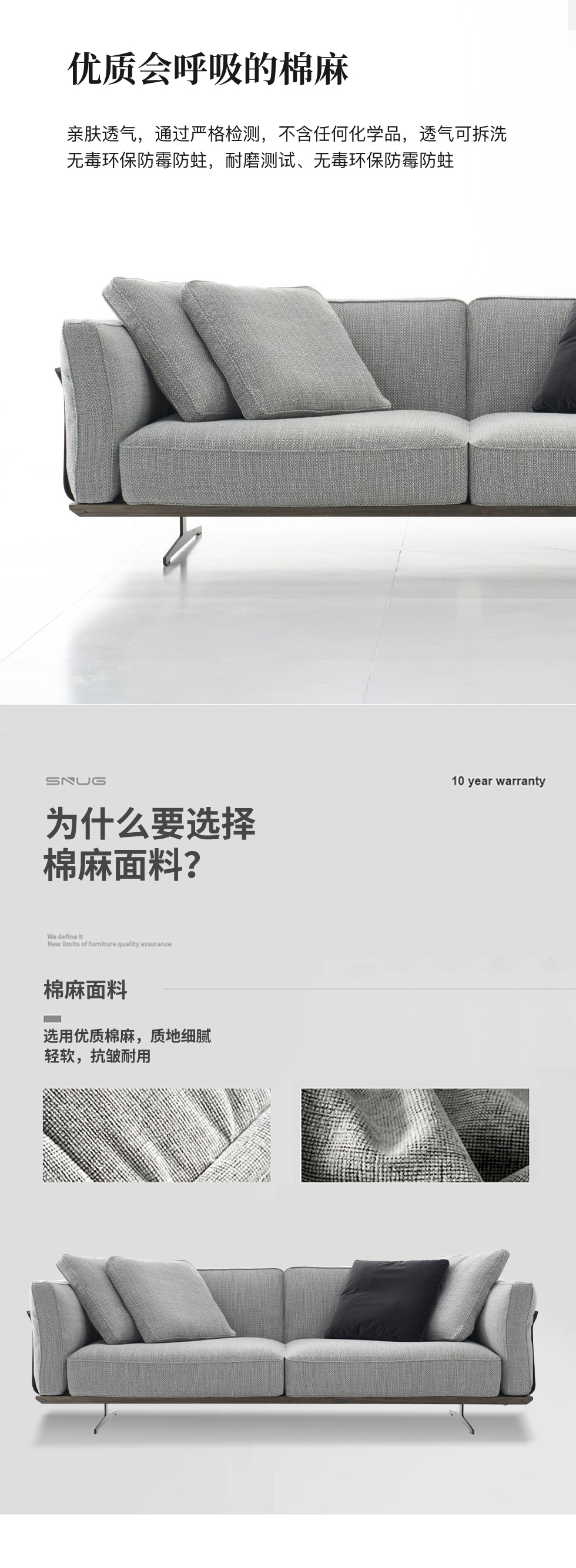 缔造 极简 优质棉麻布+羽绒+高密度海棉+碳素钢脚+北美白蜡木(做碳灰木色)边框+铁片包马铵硬皮 布艺沙发 四人位2.44米沙发