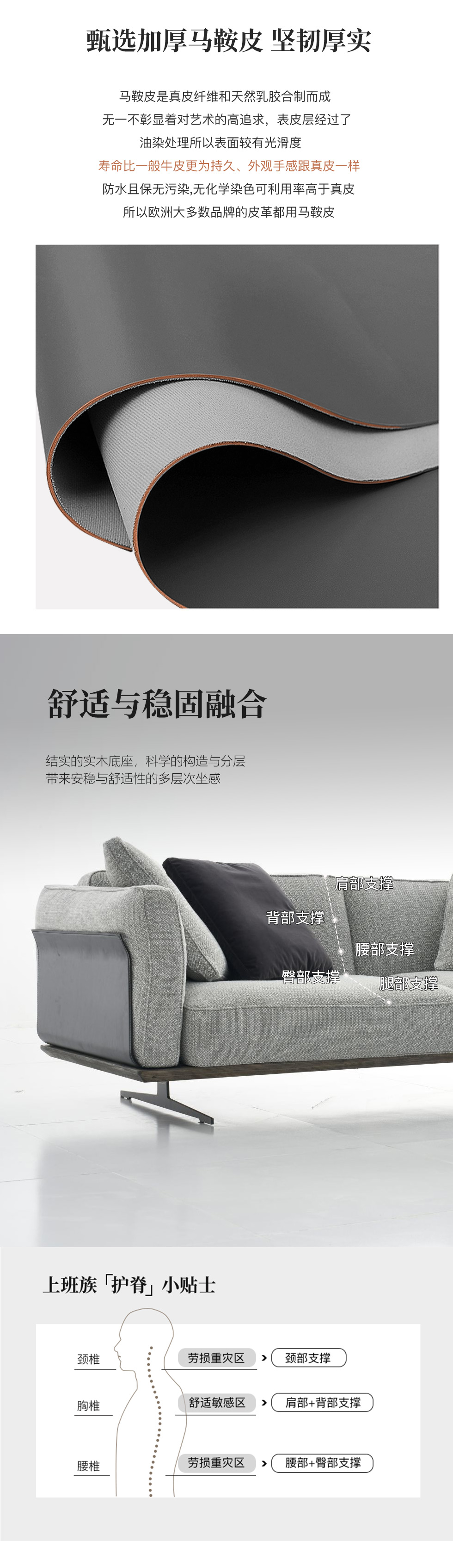 希奥 极简 进口全磨砂皮 俄罗斯樟子松 双扶四位全磨砂皮 皮2.38米沙发缔造 极简 优质棉麻布+北美白蜡木(做碳灰木色)边框+意大利进口皮+高密度海棉+不锈钢拉丝脚 布艺1.92米沙发 贵妃椅条凳
