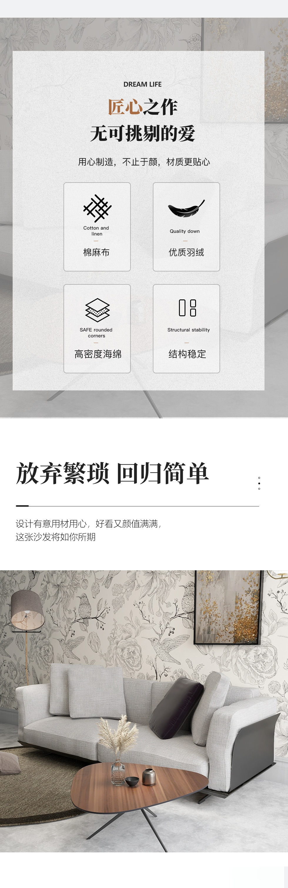 缔造 极简 优质棉麻布+羽绒+高密度海棉+实木脚 布艺沙发 两人位2.2米沙发