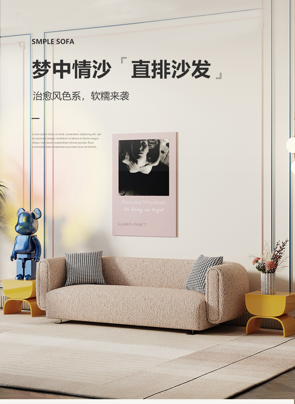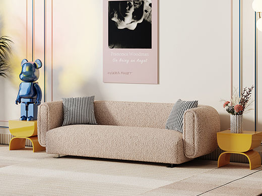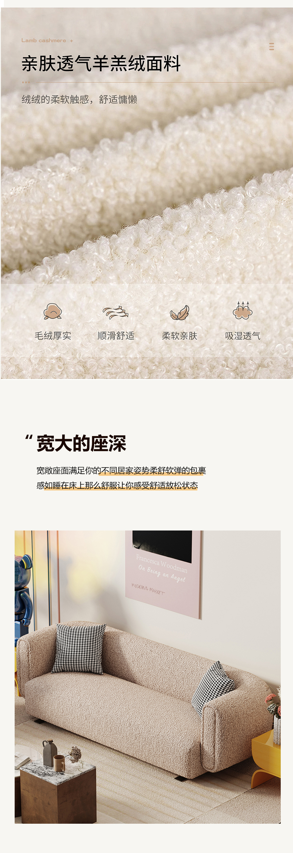 鹿屿 奶油风 羊羔绒H008- 系列(全)+实木框架+高回弹海绵+羊羔绒+五金脚 布艺沙发 三人位2.3米沙发 (含抱枕)