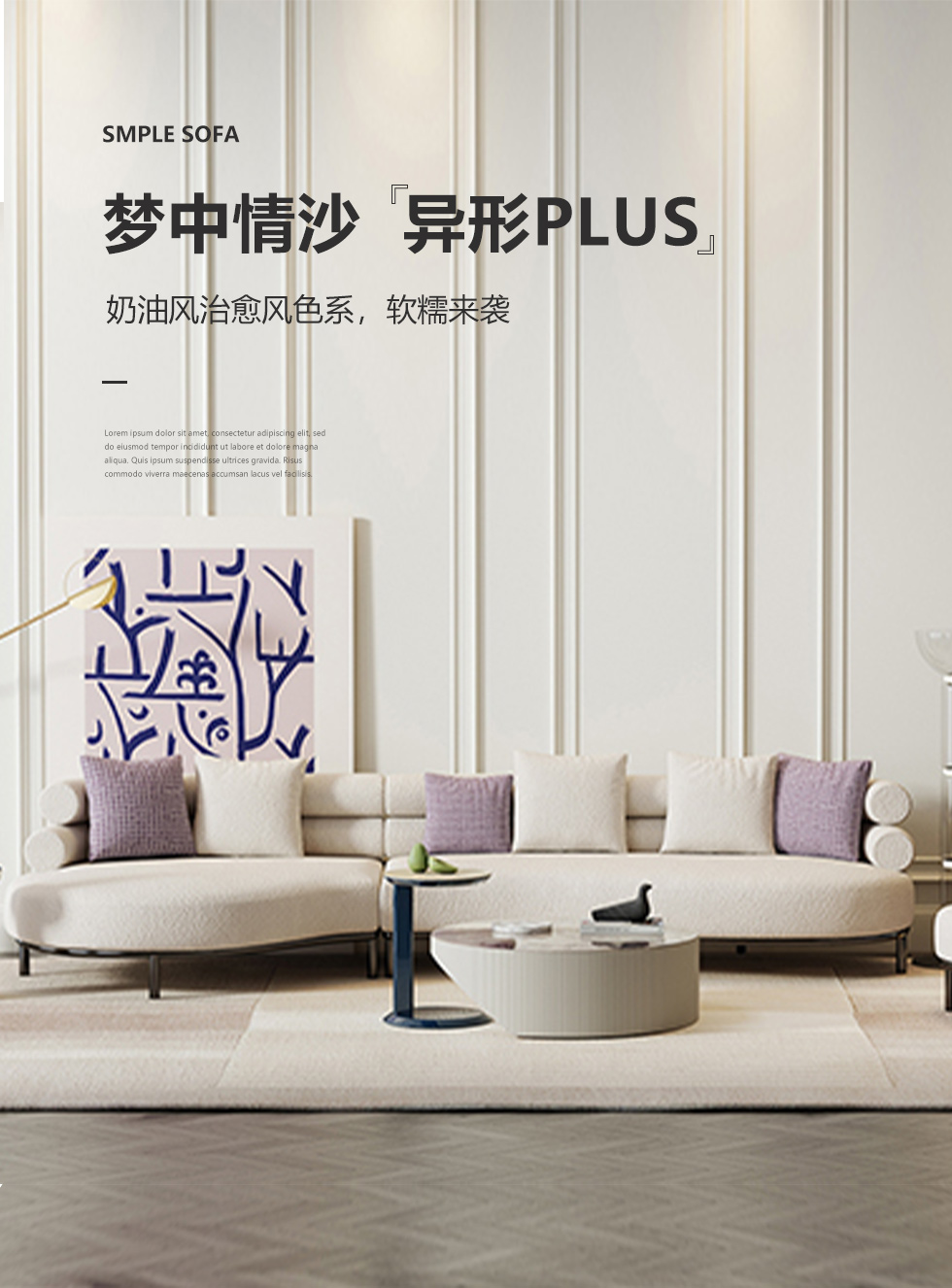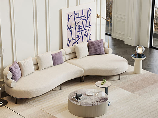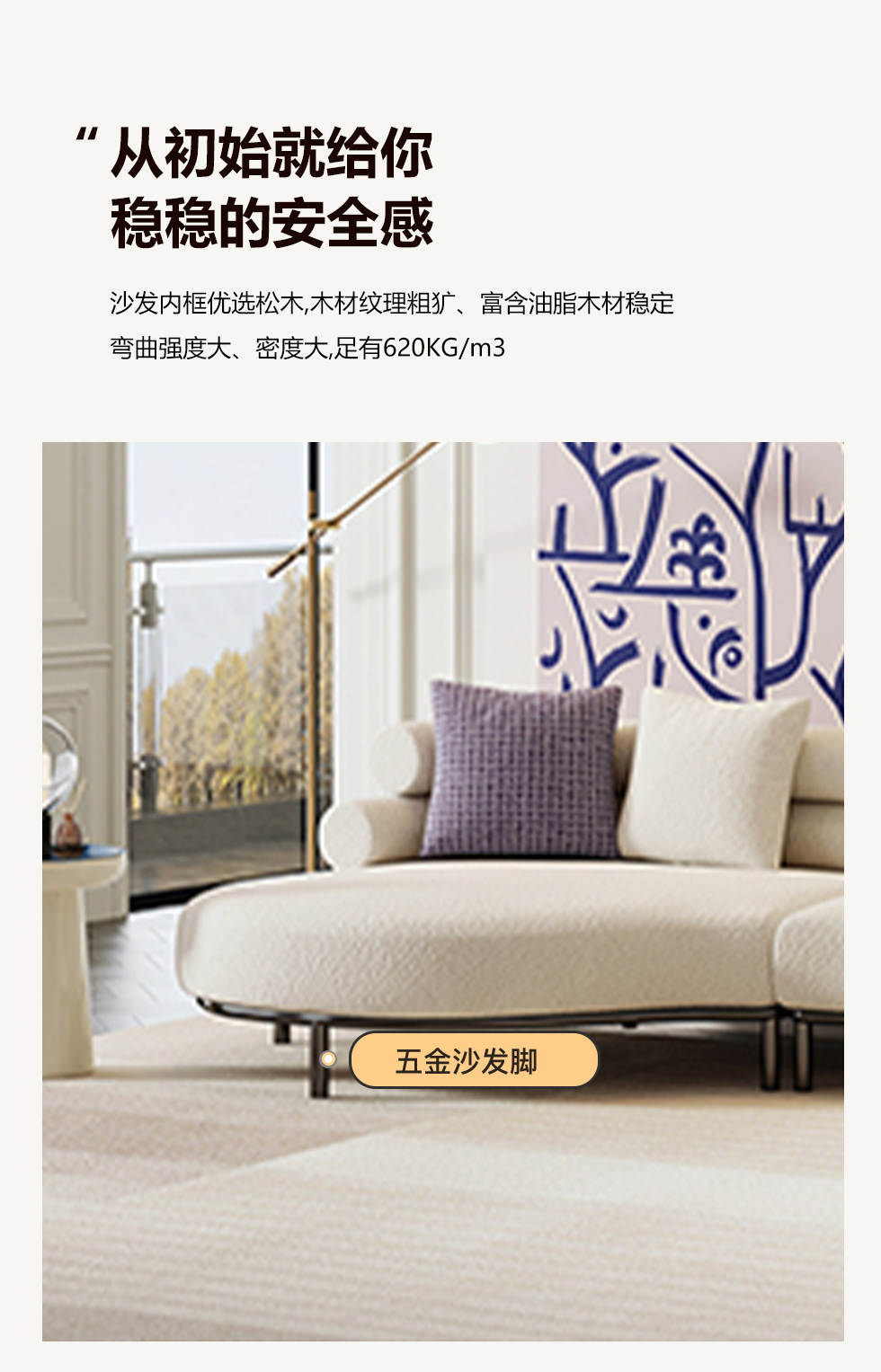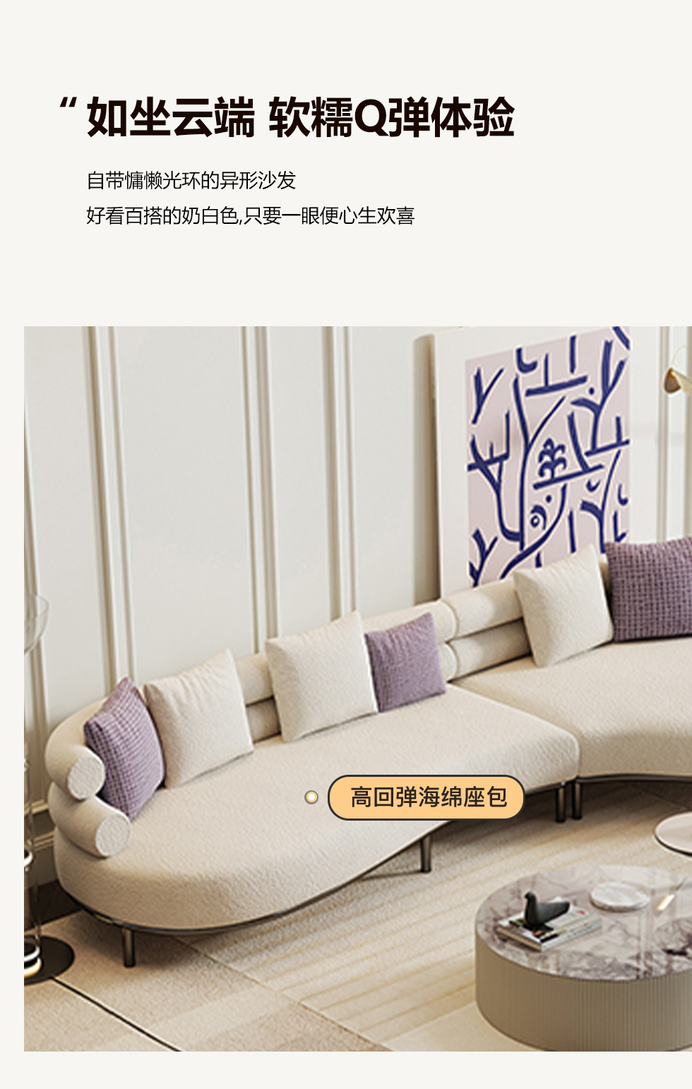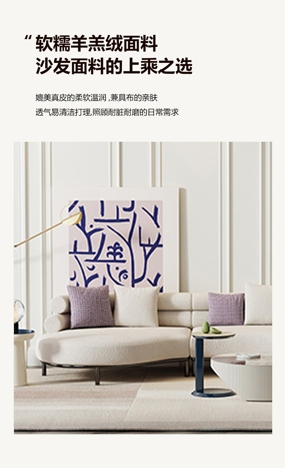 云端 奶油风 羊羔绒布料+抛光实木内架+合成板材框架+坐包填充高密度纯海绵+5公分实木圆脚 米白色 2.7米四人位+圆凳¥4660