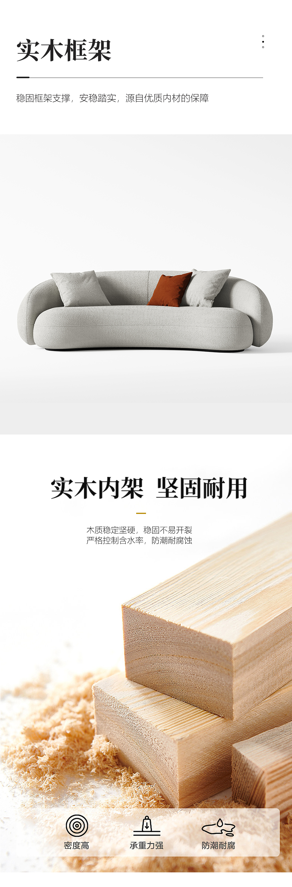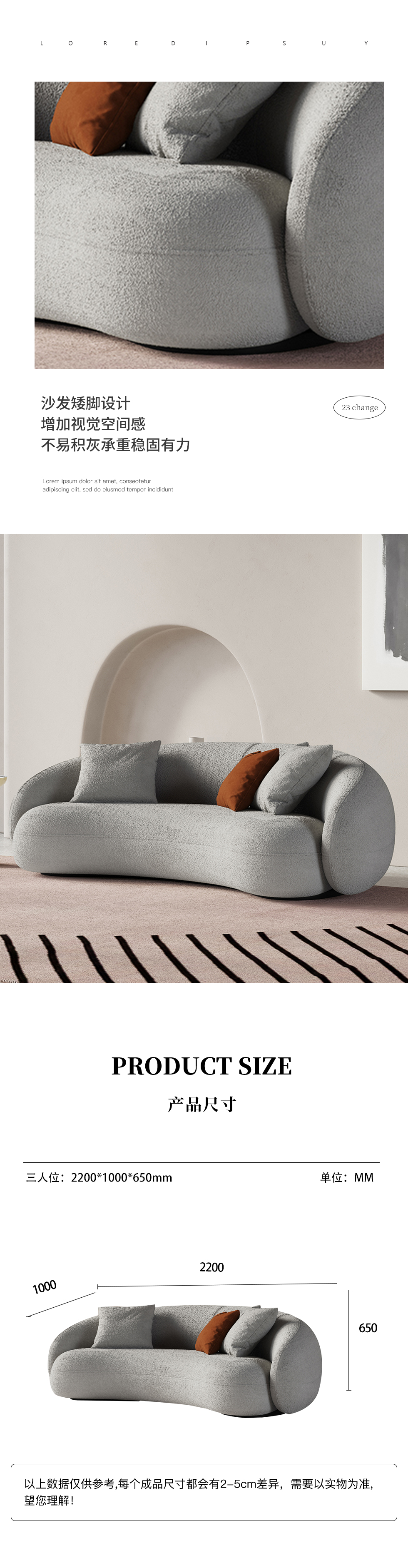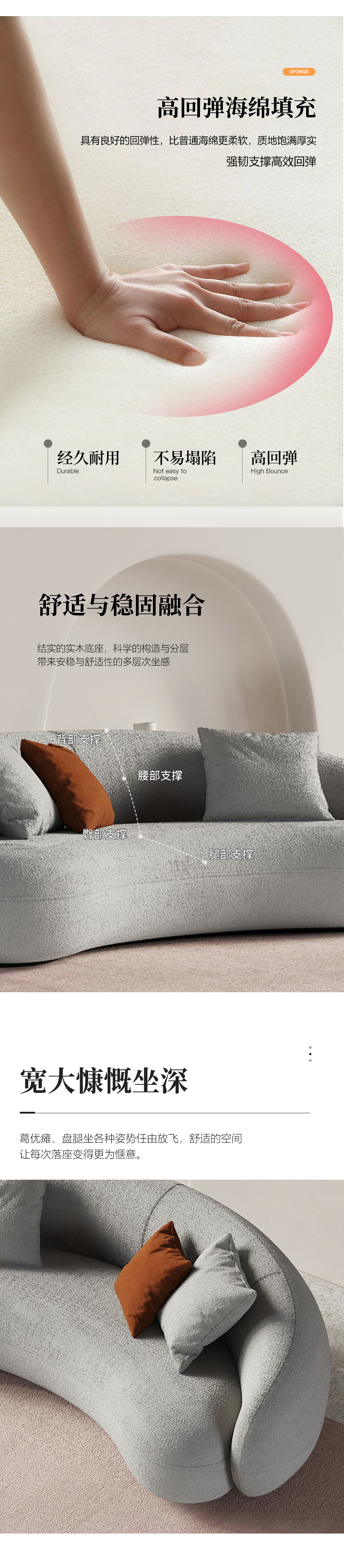Minttu明途 极简 实木框架+高回弹海绵+羊羔绒+实木脚 网红豆荚直排三人位布艺弧形2.2米沙发(含抱枕)