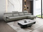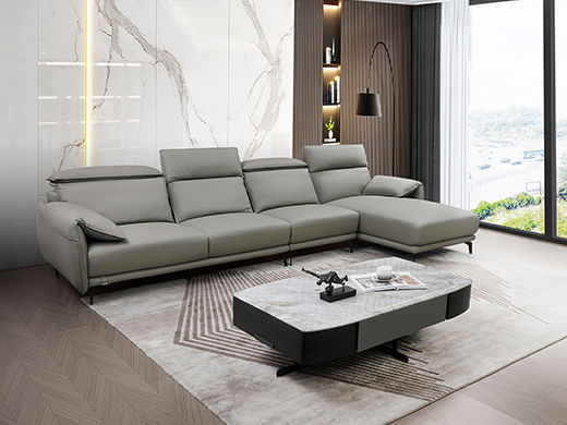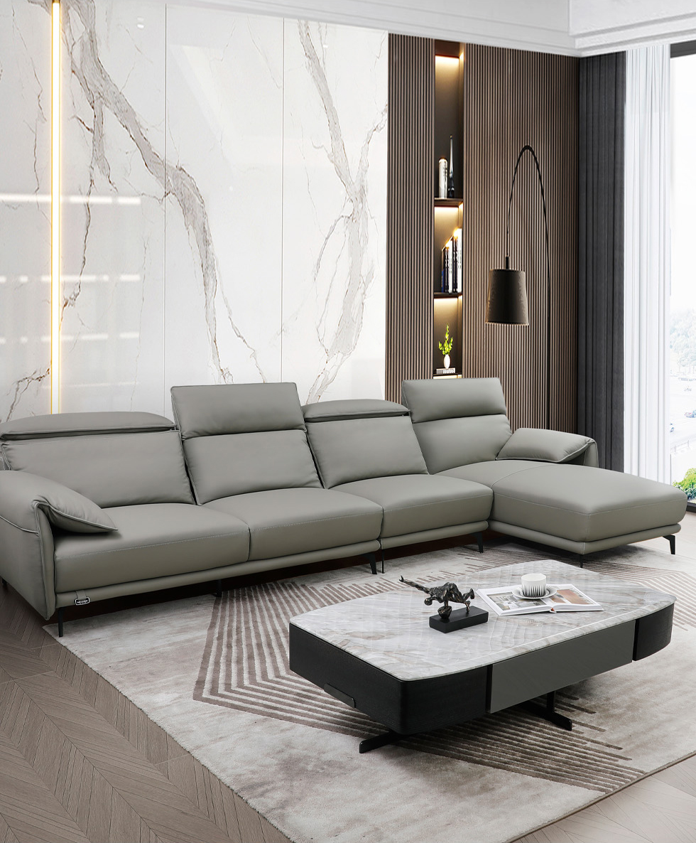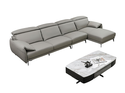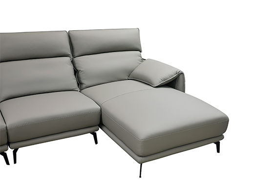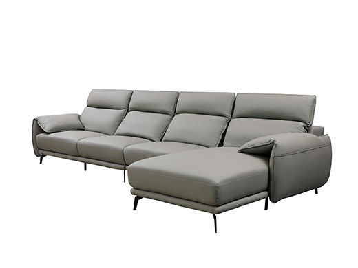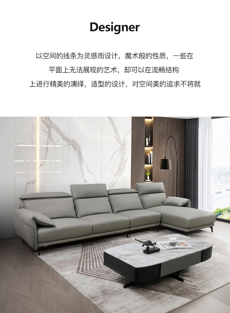 e家优选 现代简约 接触面头层黄牛皮 按木松木组合内框架 蛇簧+绷带 高回弹海棉座包 扶手头枕活动腰包羽绒填充 头枕6档可以调节功能 中灰 1+3+左贵妃 皮艺功能转角沙发