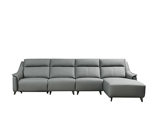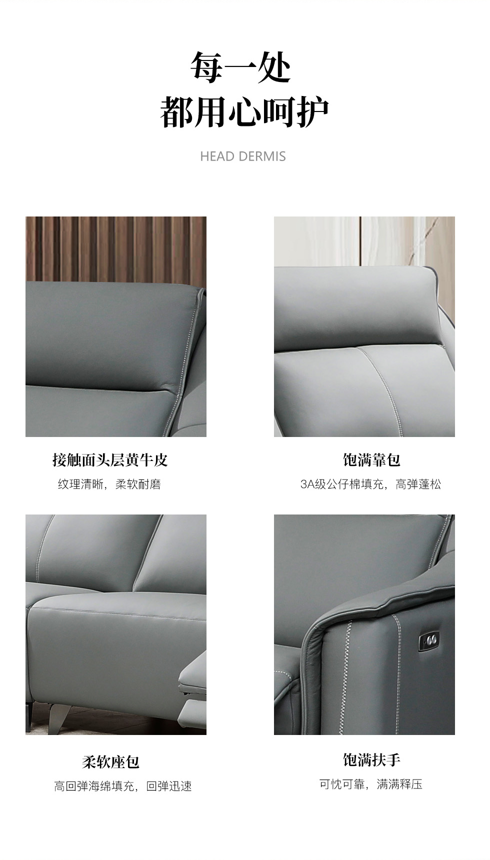 e家优选 现代简约 接触面头层黄牛皮 按木松木组合内框架 蛇簧+带 高回弹海棉座包 靠背3A公仔Q弹棉填充 功能架迈博五金 中灰 1+3+左贵妃带一个电动 皮艺功能转角沙发