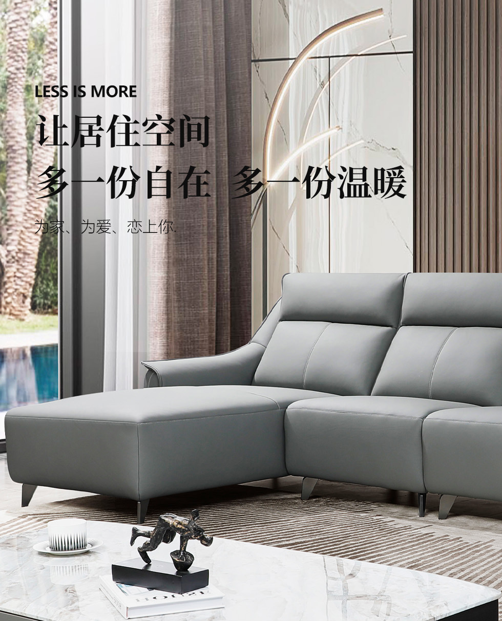 e家优选 现代简约 接触面头层黄牛皮 按木松木组合内框架 蛇簧+绷带 高回弹海棉座包 扶手头枕活动腰包羽绒填充 头枕6档可以调节功能 中灰 1+3+左贵妃 皮艺功能转角沙发