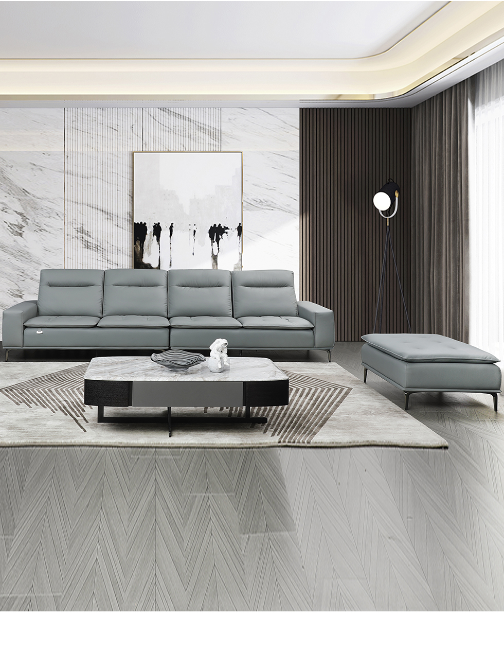 e家优选 现代简约 接触面头层黄牛皮 按木松木组合内框架 蛇簧+绷带 高回弹海棉座包 靠背3A公仔Q弹棉填充 中灰蓝 1+3+左贵妃 皮艺转角沙发¥12097