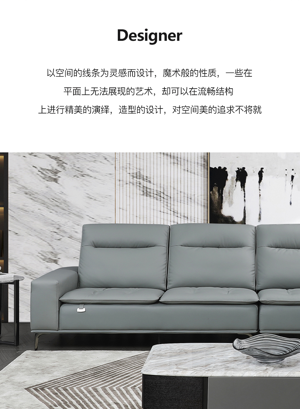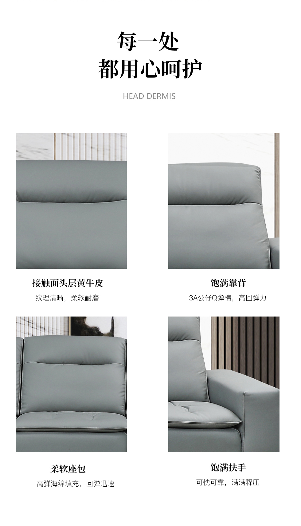 E家优选 现代简约 接触面进口头层牛皮+进口 落叶松+高 回弹海绵+锐迈电机 三电动功能2.75米沙发床e家优选 现代简约 接触面头层黄牛皮 按木松木组合内框架 蛇簧+绷带 高回弹海棉座包 靠背3A公仔Q弹棉填充 中灰蓝 1+3+左贵妃 皮艺转角沙发