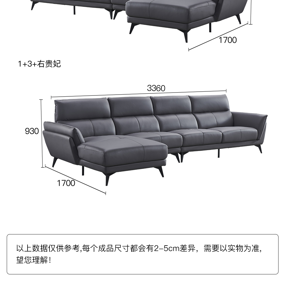 德卡图 现代简约 松木+多层板板+接触面头层牛皮+仿皮+高回弹海绵+靠包羽绒填充+胶脚 直排贵妃+无扶单+左贵妃(座前、拼顶仿皮 ) 3.75米沙发¥11247