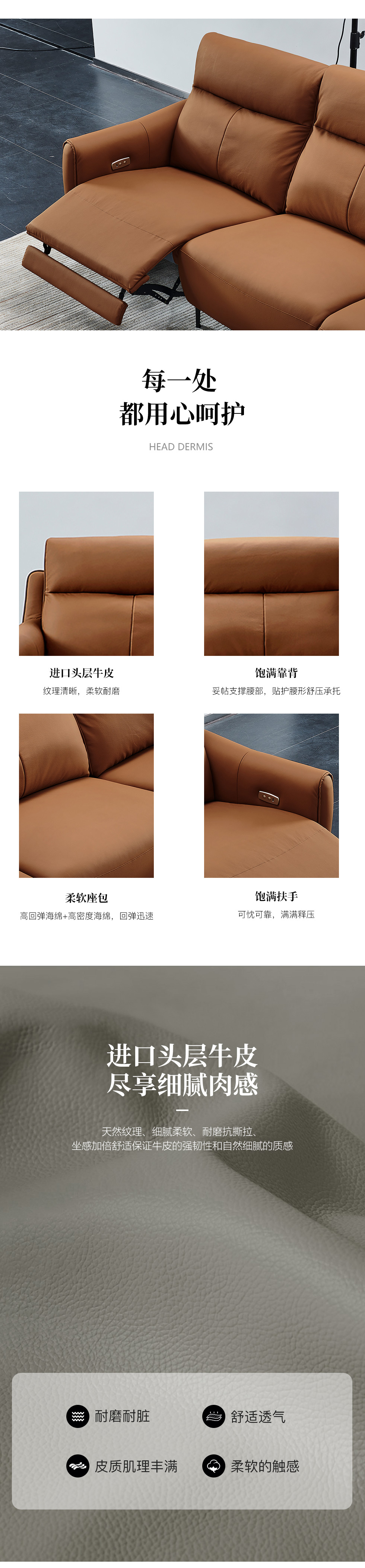 德卡图 现代简约 接触面进口头层牛皮+高回弹海绵+高密度海绵+俄罗斯进口落叶松框架+靠背公仔棉 单位(功能)+三位+左贵妃位 焦糖橙色 皮艺转角3.3米沙发