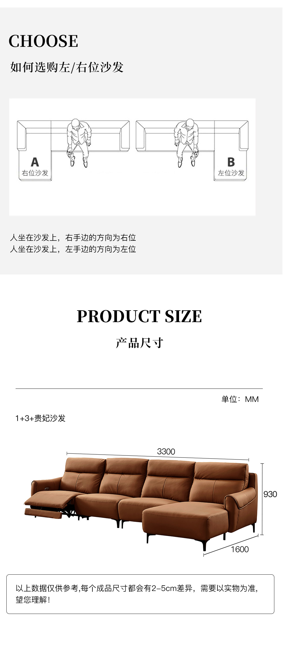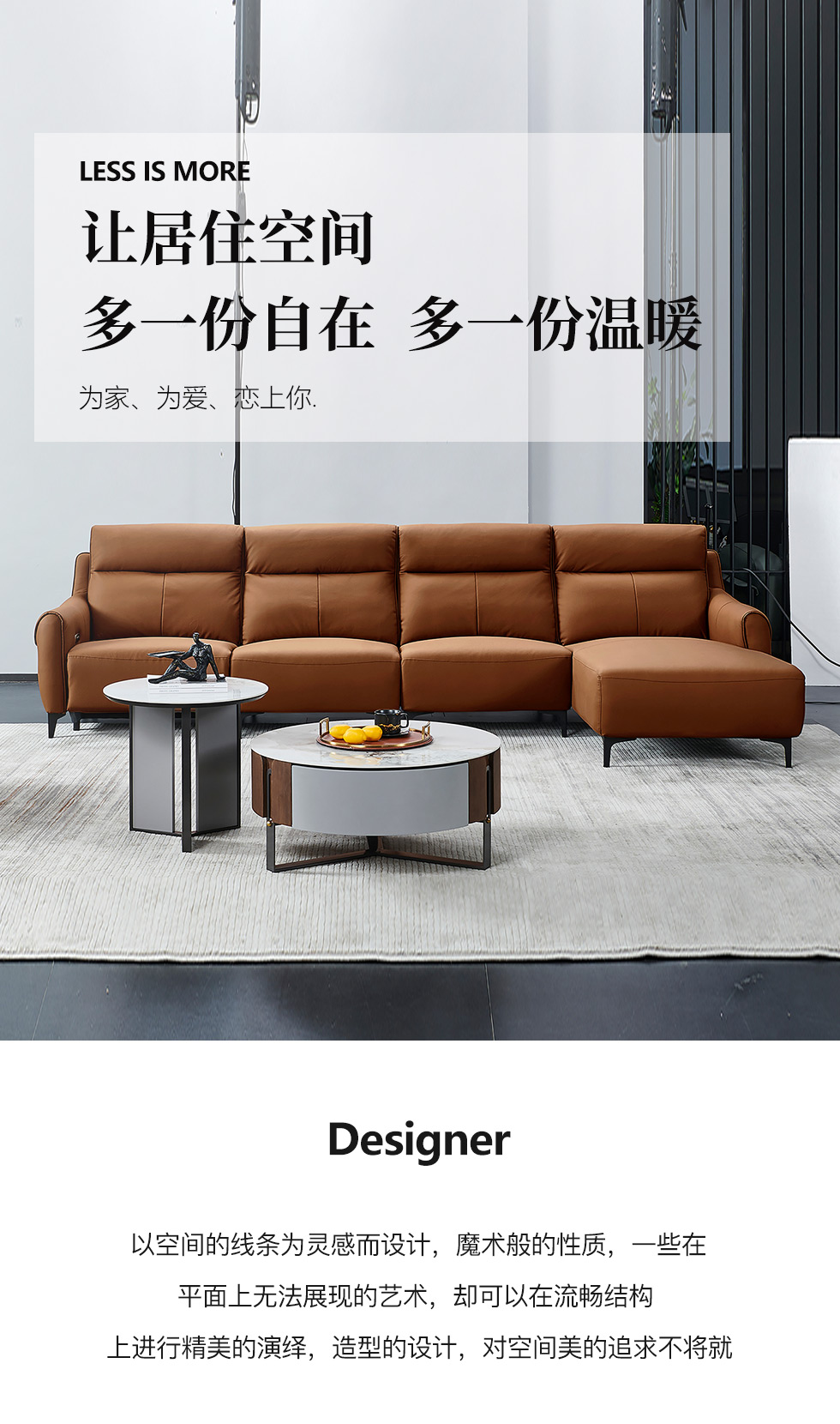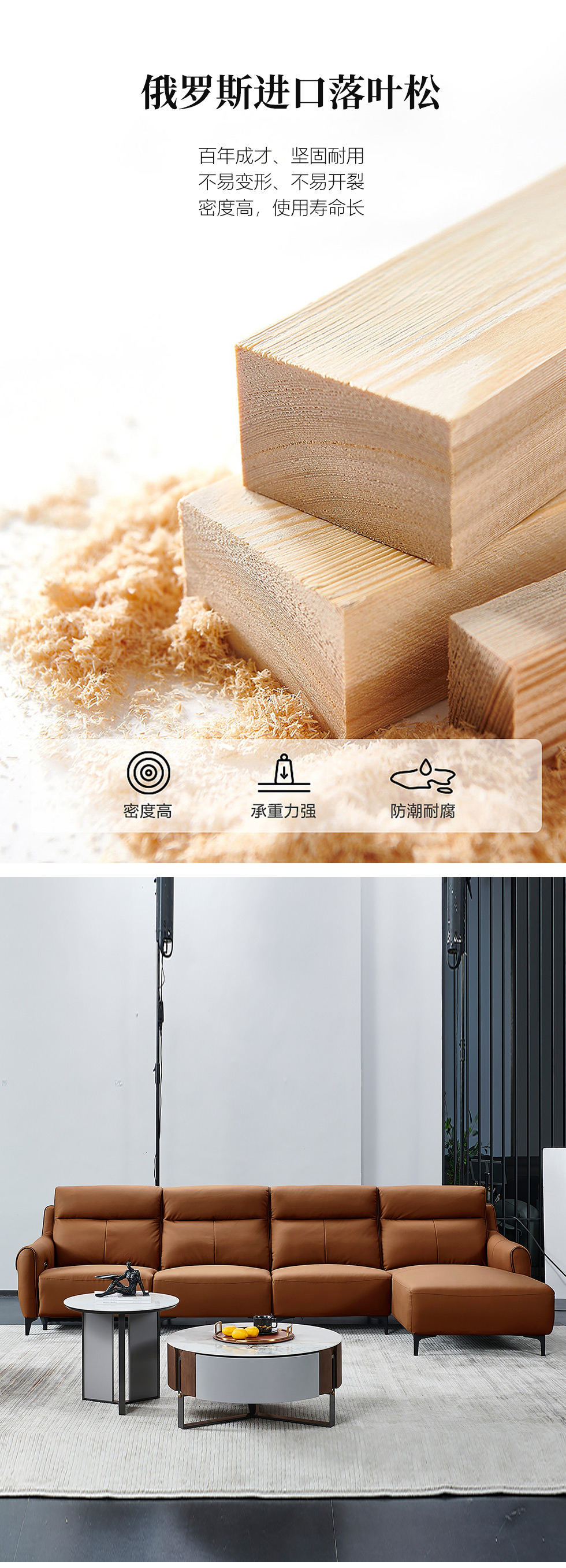 德卡图 现代简约 接触面进口头层牛皮+高回弹海绵+高密度海绵+俄罗斯进口落叶松框架+靠背公仔棉 单位(功能)+三位+左贵妃位 焦糖橙色 皮艺转角3.3米沙发 |