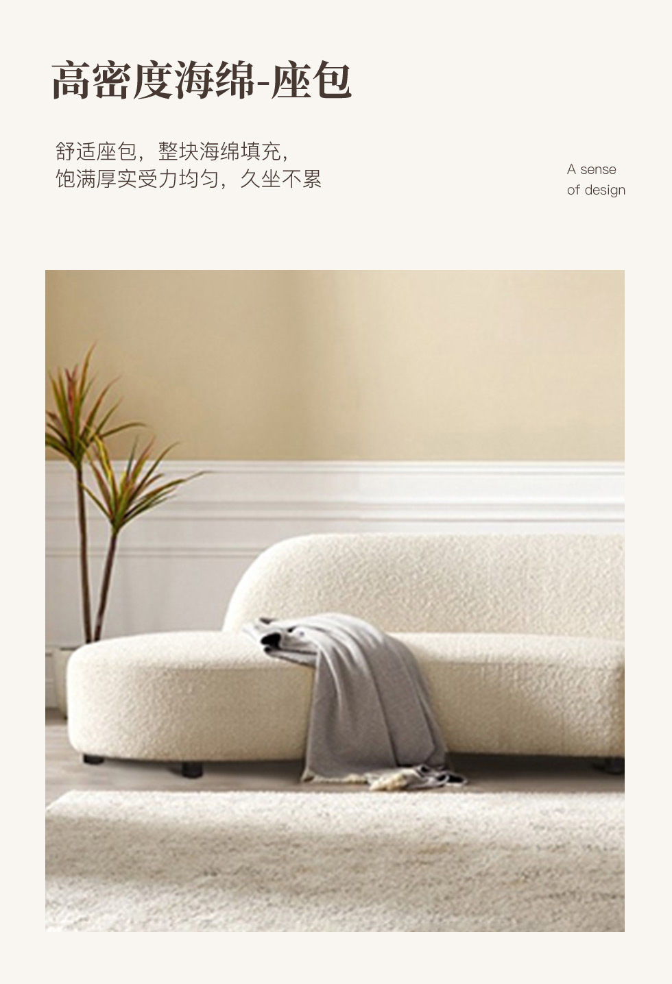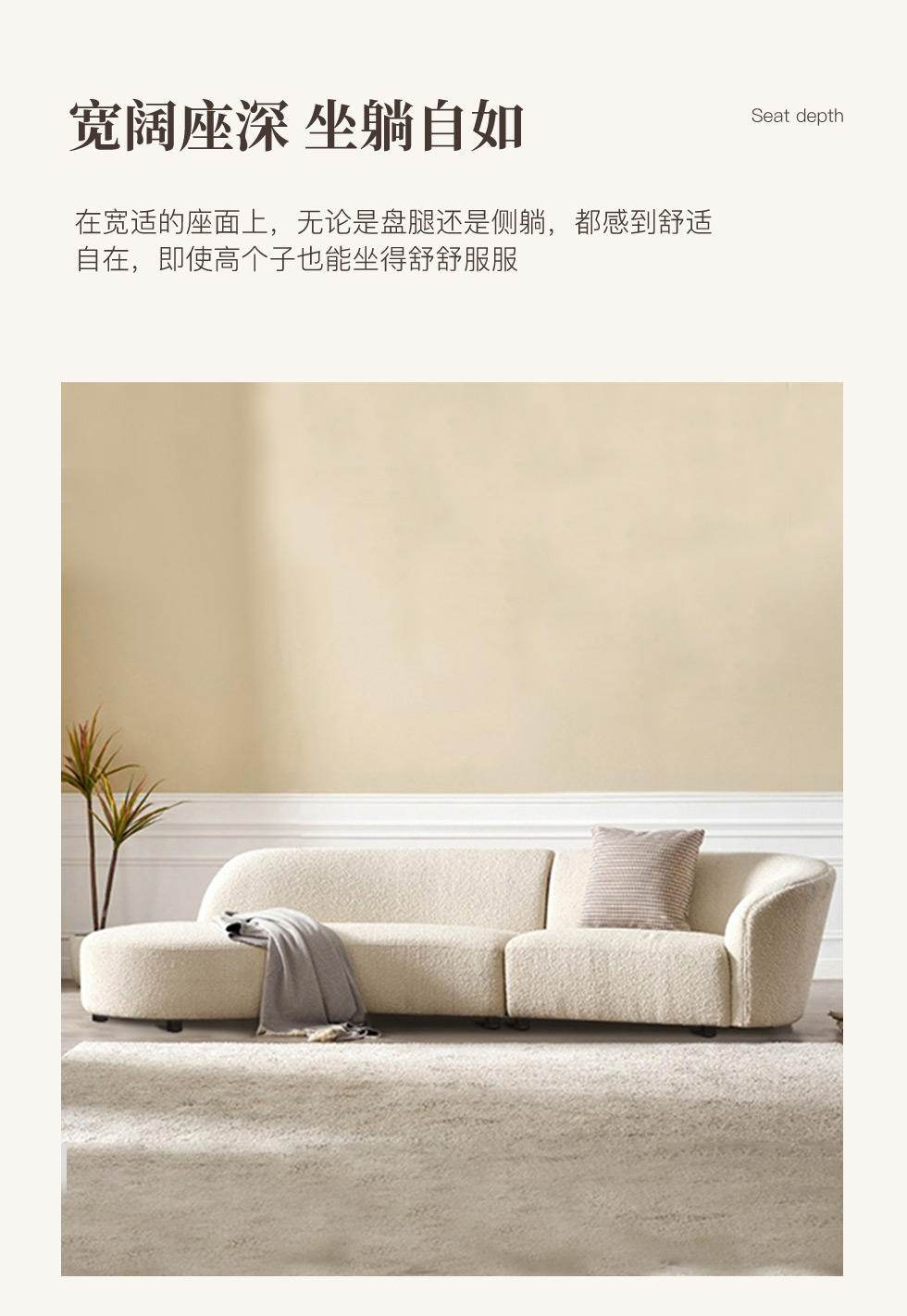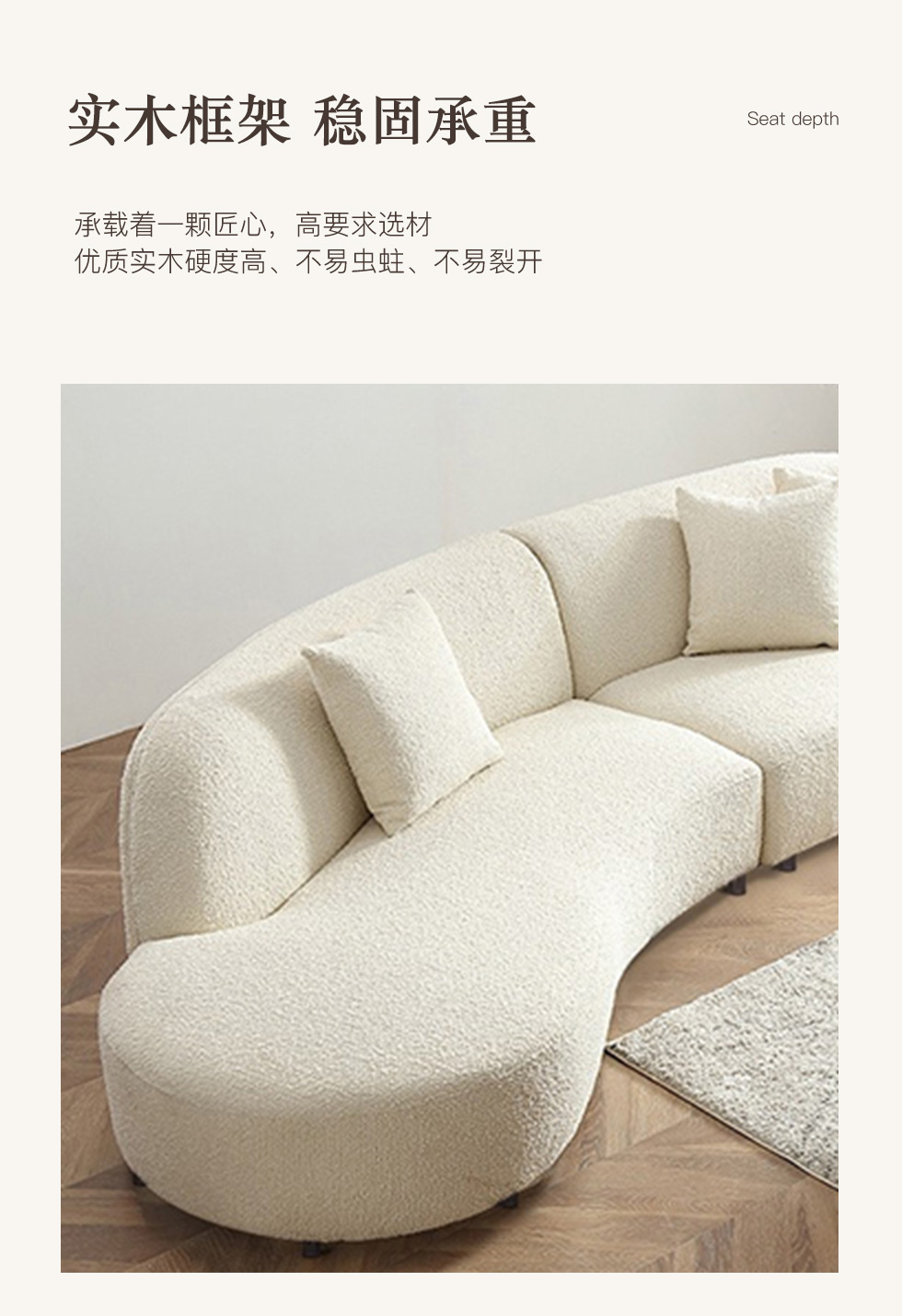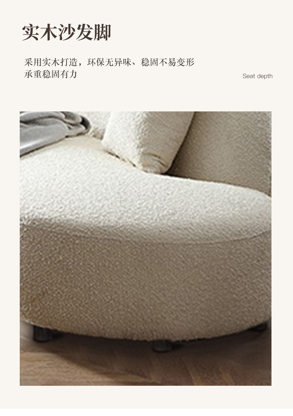 云端 奶油风 羊羔绒布料+抛光实木内架+合成板材框架+坐包填充高密度纯海绵+5公分实木圆脚 米白色 2.7米四人位+圆凳