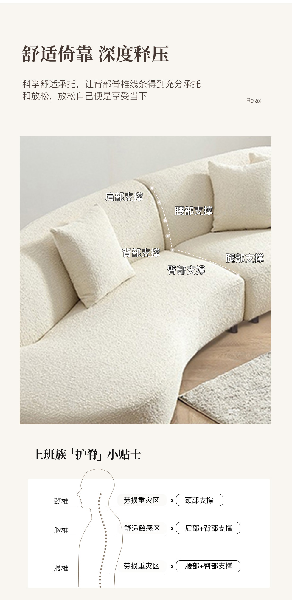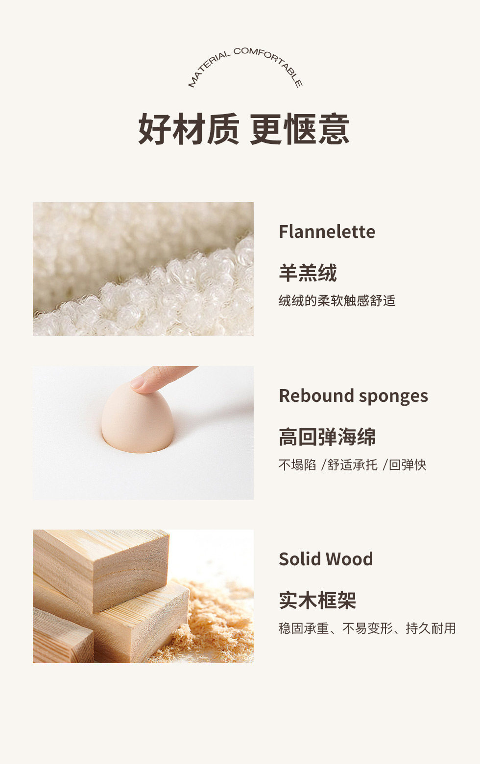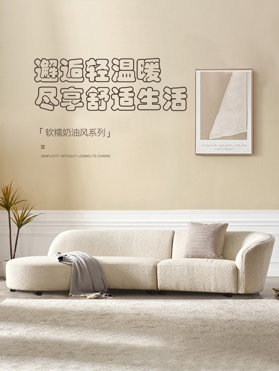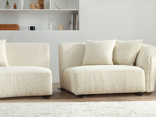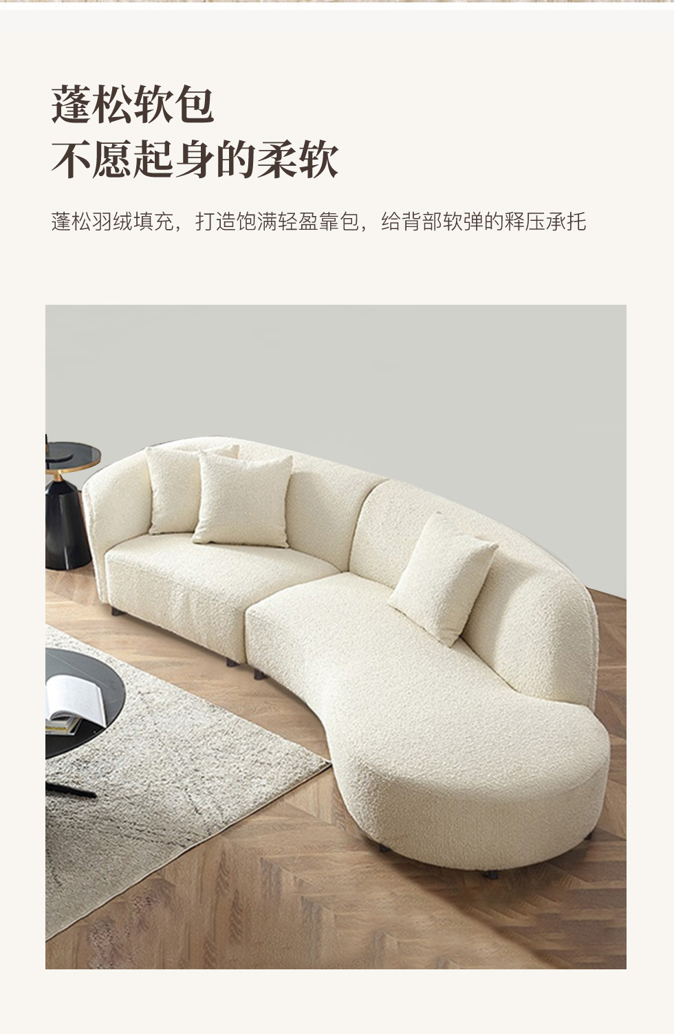 云端 奶油风 羊羔绒布料+抛光实木内架+合成板材框架+坐包填充高密度纯海绵+5公分实木圆脚 米白色 2.7米四人位+圆凳