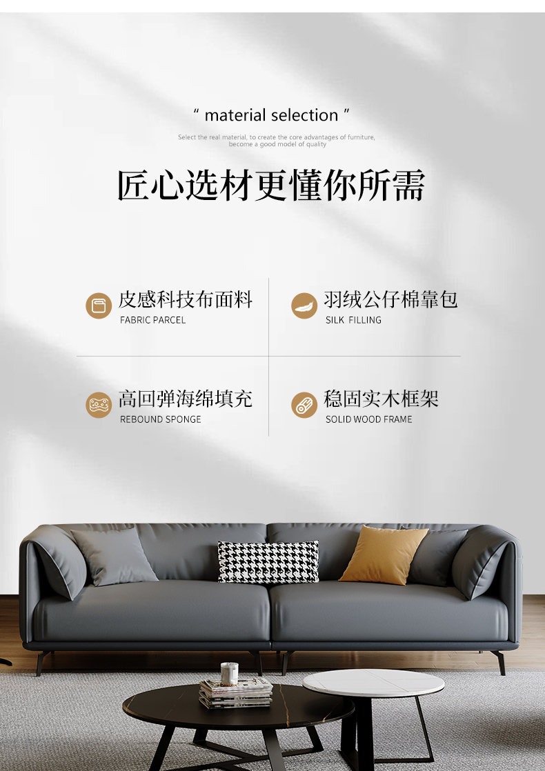 非凡工艺 现代简约 科技布+高密度海绵+羽绒+松木+桉木+弹簧+橡筋+网布+实木脚 2.9米 四人位 布艺沙发非凡工艺 现代简约 接触面头层牛皮+优质回弹海绵+框架落叶松木+绒丝棉+多层实木夹板+5cm黑砂五金脚 左单+右三 2.8米 4人位 沙发