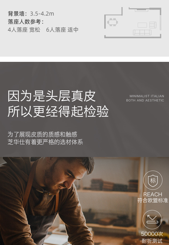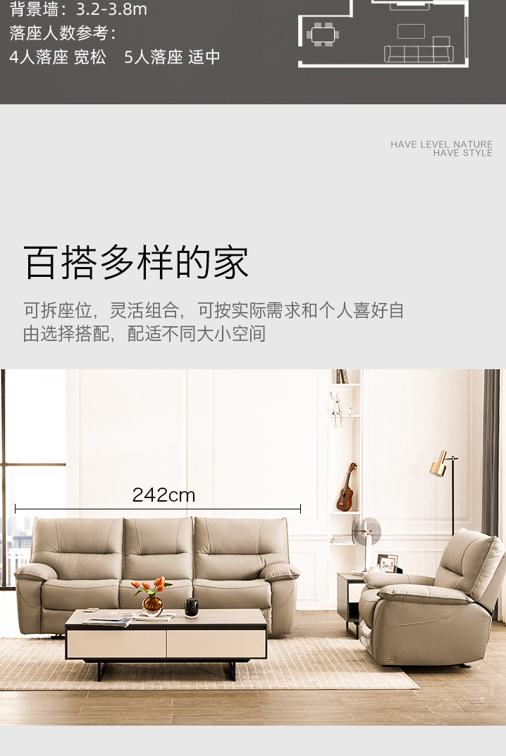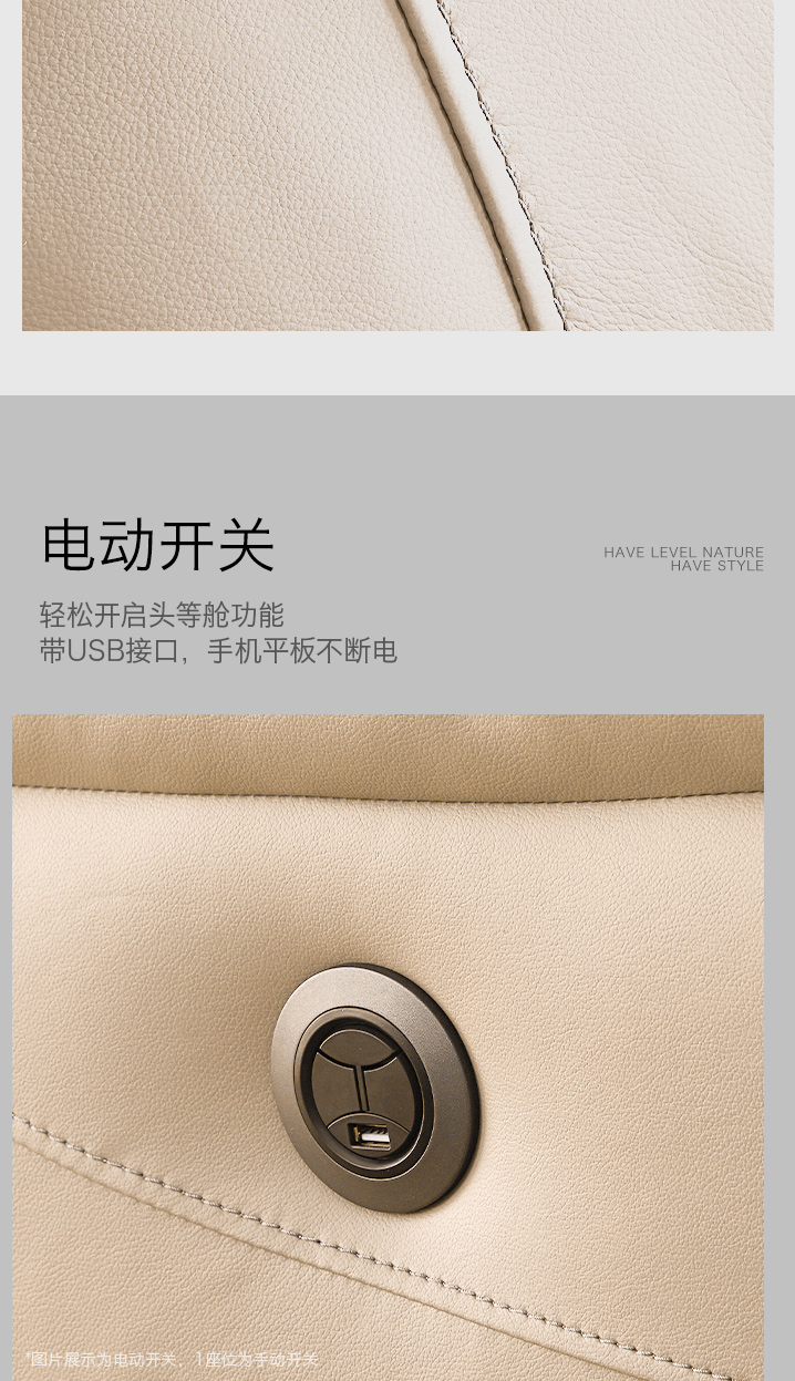 甄品家具 现代简约 接触面进口头层牛皮+进口 落叶松+高 回弹海绵+高承重碳 钢功能架+零靠墙锐迈电机+单电动功能 碳素钢脚 3米 三人位 单电动功能沙发
