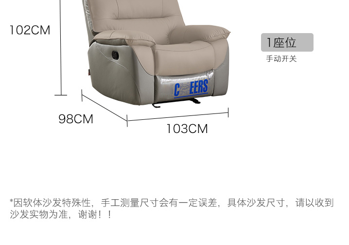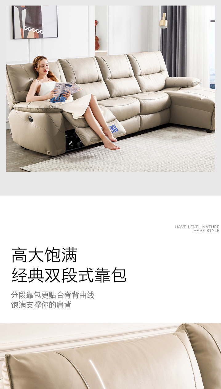 甄品家具 现代简约 接触面进口头层牛皮+进口 落叶松+高 回弹海绵+高承重碳 钢功能架+零靠墙锐迈电机+单电动功能 碳素钢脚 3米 三人位 单电动功能沙发