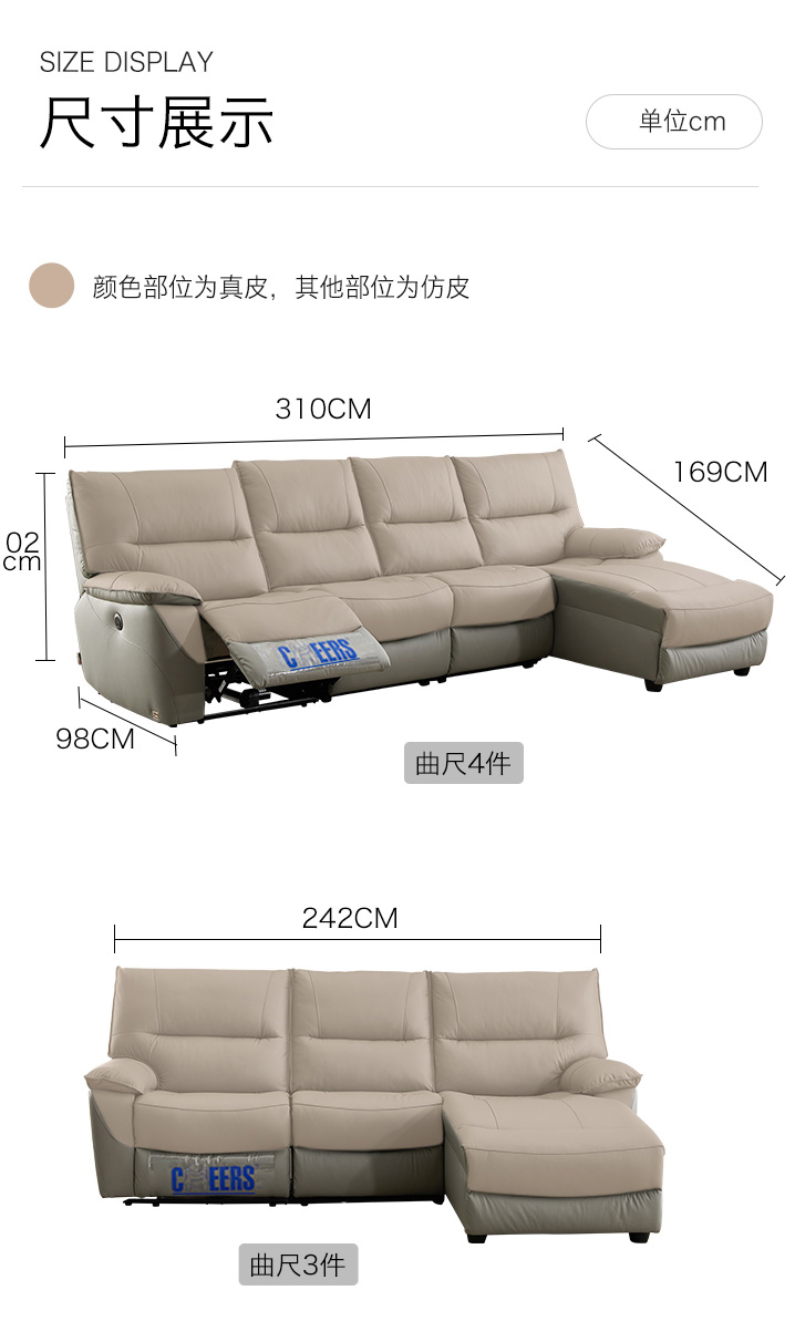 甄品家具 现代简约 接触面进口头层牛皮+进口 落叶松+高 回弹海绵+高承重碳 钢功能架+零靠墙锐迈电机+单电动功能 碳素钢脚 3米 三人位 单电动功能沙发