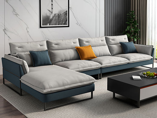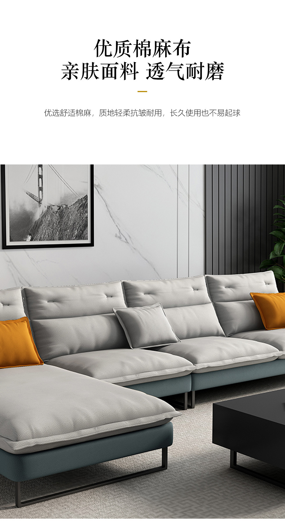 B系优选 现代简约 高级棉麻布+环保西皮+仿皮+优质回弹海绵+框架落叶松木+3A级公仔棉+多层实木夹板+黑砂铁艺脚 3.6米转角沙发 (3+左转角贵妃)