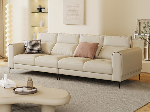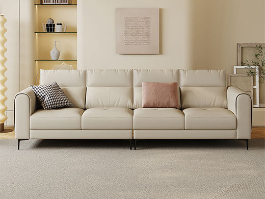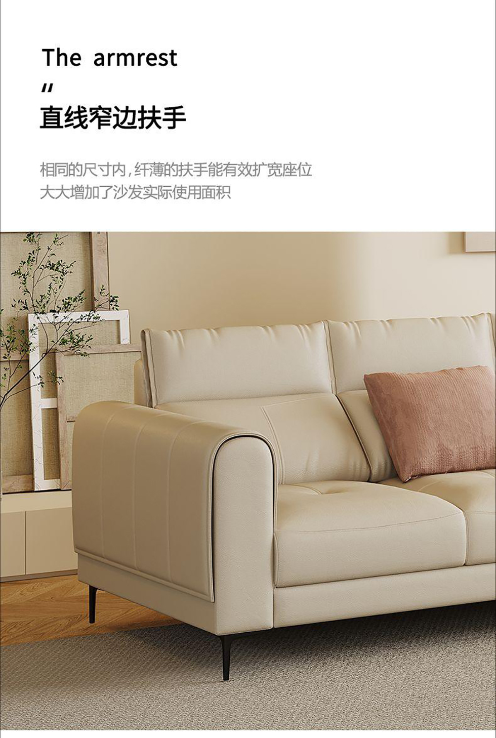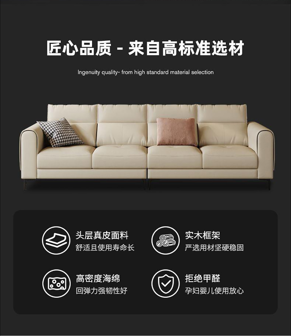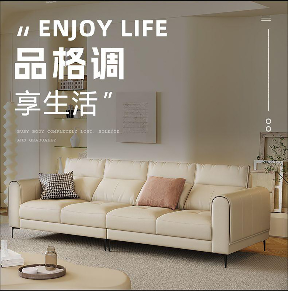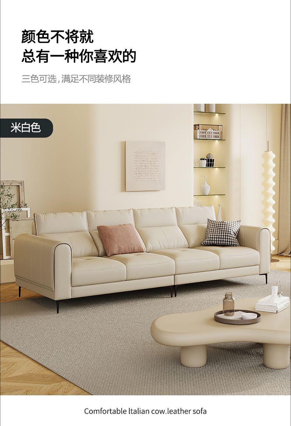 B系优选 奶油风 接触面头层黄牛皮+仿皮 E1级夹板+松木框架 无粉高密度海绵 座包紫罗兰海绵 样色 直排3.2米四人位 皮艺沙发