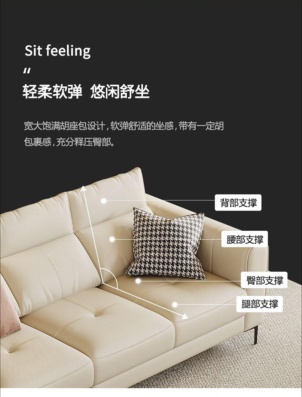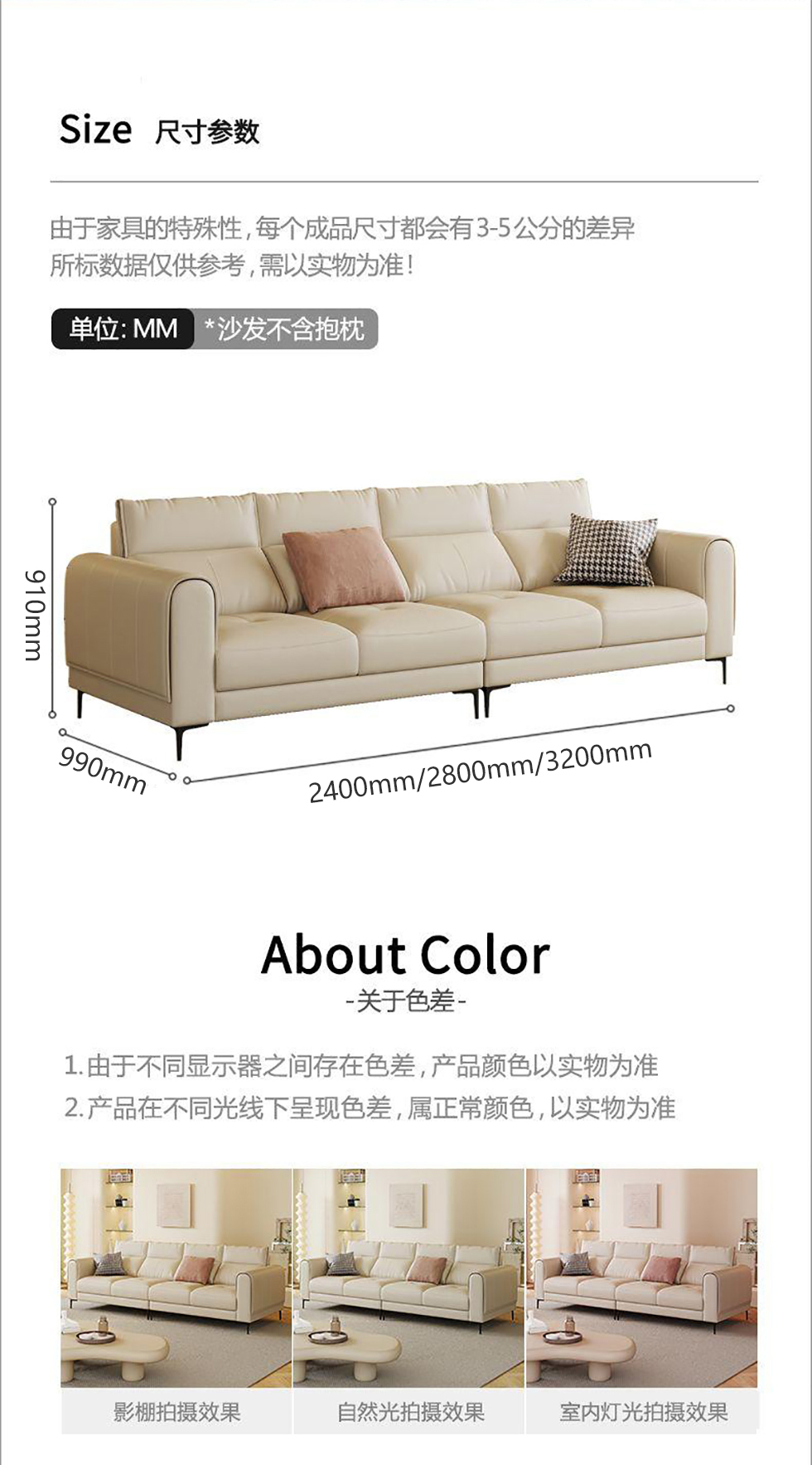 B系优选 奶油风 接触面头层黄牛皮+仿皮 E1级夹板+松木框架 无粉高密度海绵 靠包、扶手包填充羽绒+公仔棉 样色 直排2.8米大三人位 皮艺沙发