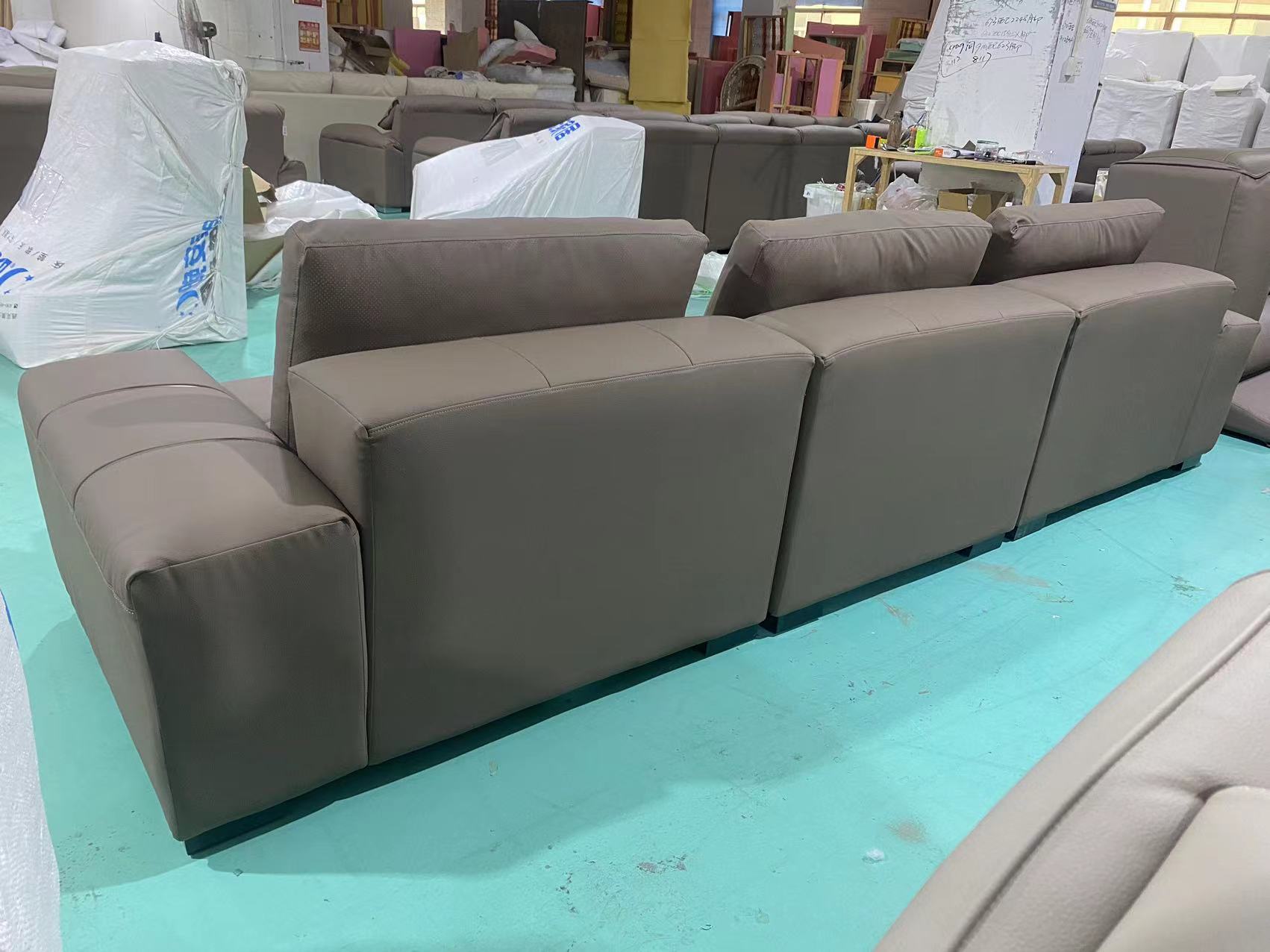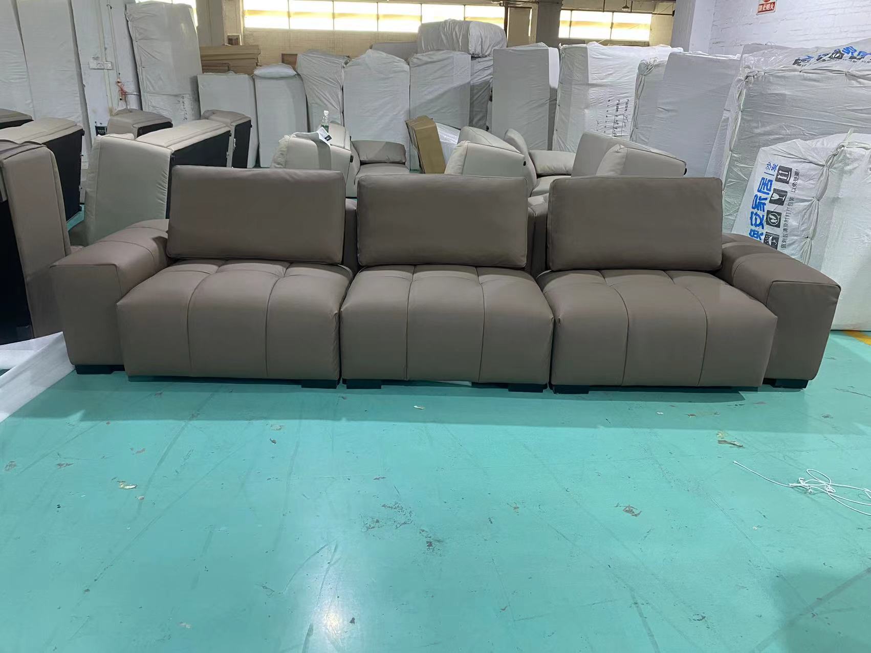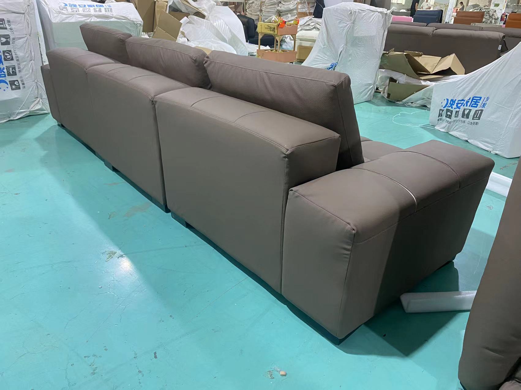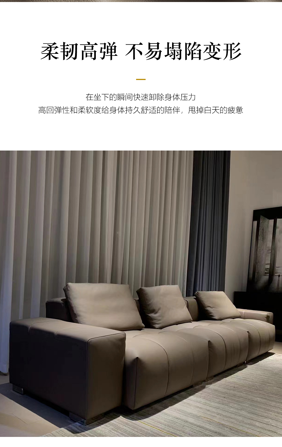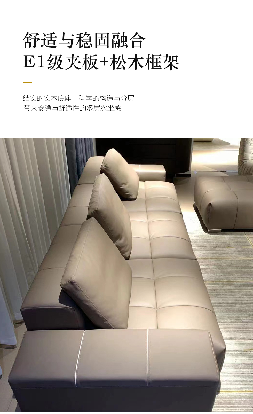 B系优选 现代简约 接触面头层黄牛皮+仿皮 E1级夹板+松木框架 无粉海绵 靠包赛羽绒+公仔棉填充 样色 直排3.2米四人位 皮艺沙发
