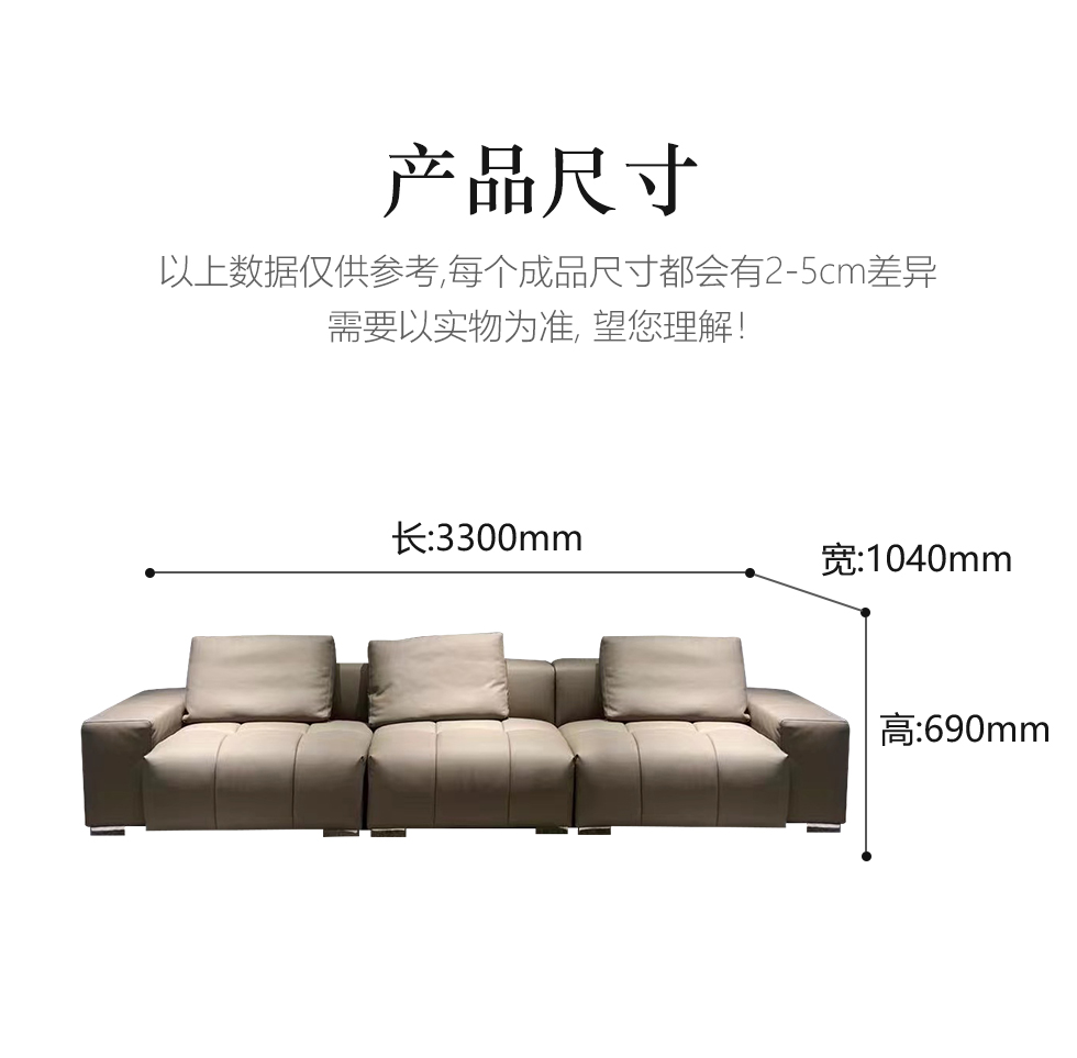 B系优选 现代简约 接触面头层黄牛皮+仿皮 E1级夹板+松木框架 无粉高密度海绵 靠包填充羽绒+公仔棉 样色 直排3.3米四人位 3.3米 皮艺沙发(不含脚踏) |