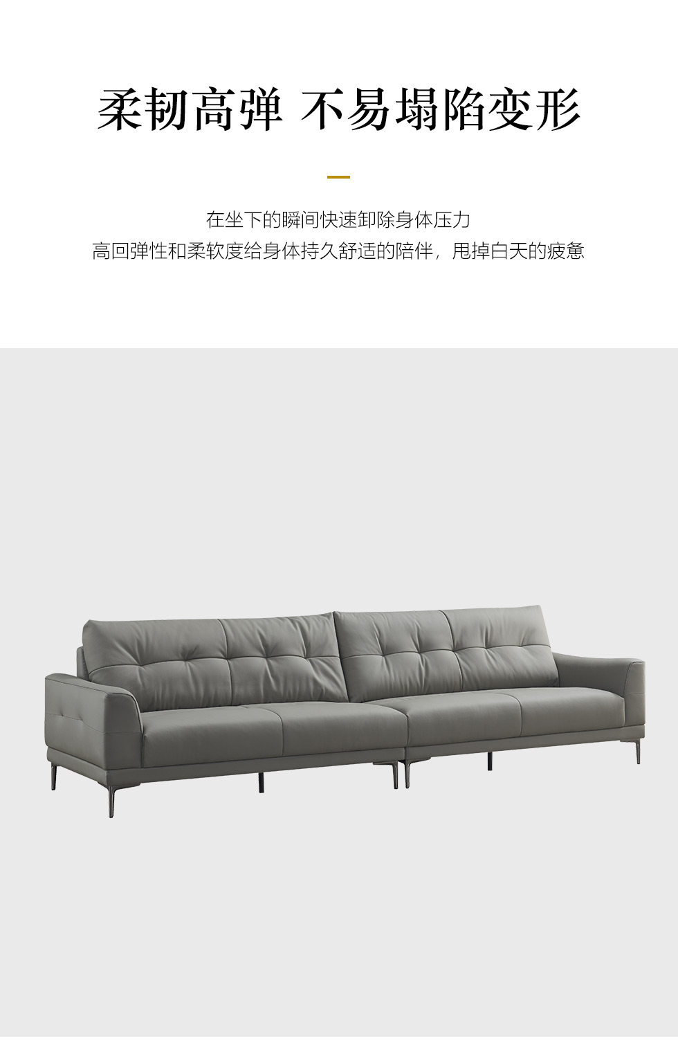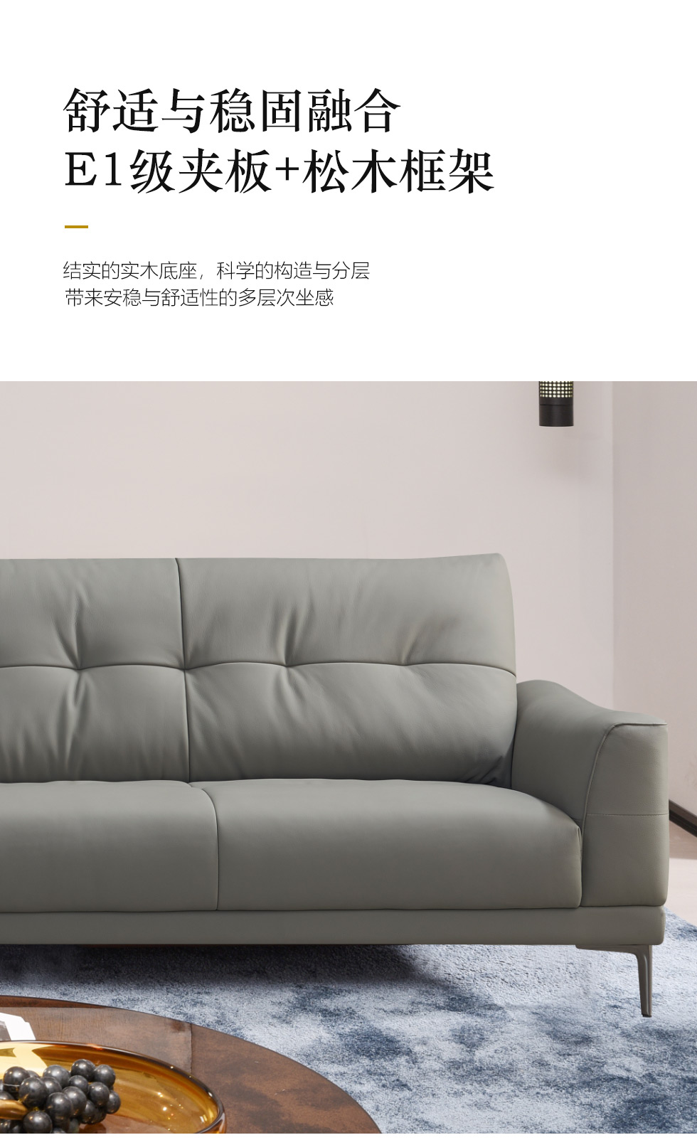 非凡工艺 现代简约 接触面头层黄牛皮+仿皮 E1级夹板+松木框架 无粉海绵 座包35D高回弹海绵 靠背公仔棉+羽绒填充 样色 直排2.8米大三人位 皮艺沙发