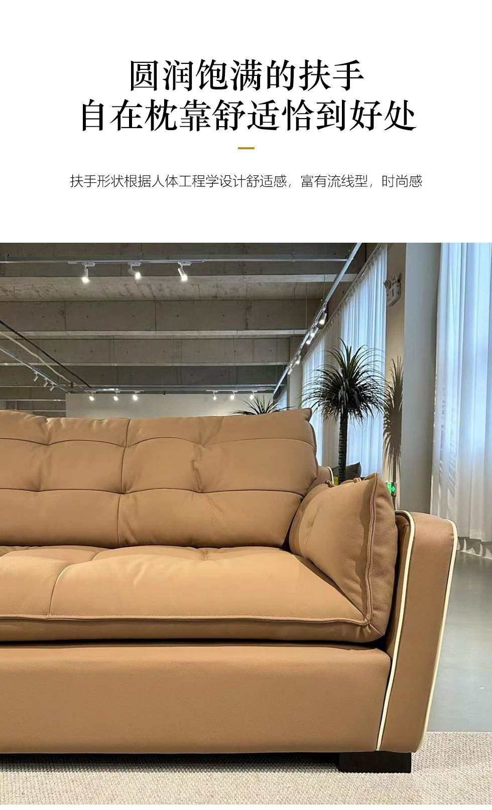 B系优选 现代简约 接触面头层黄牛皮+仿皮 E1级夹板+松木框架 无粉海绵 靠包赛羽绒+公仔棉填充 样色 直排3.2米四人位 皮艺沙发