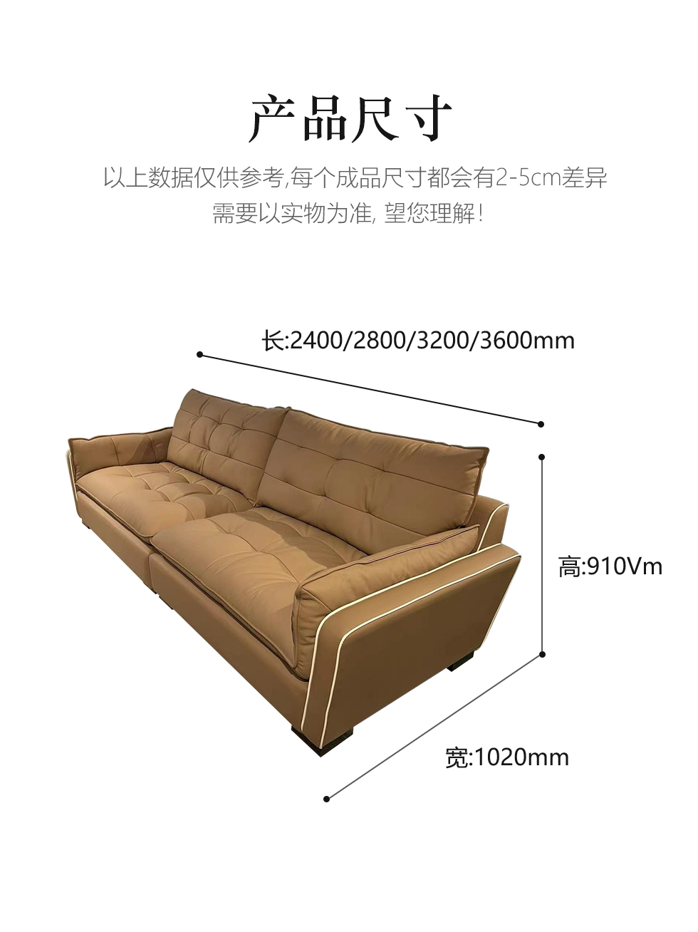 B系优选 奶油风 接触面头层黄牛皮+仿皮 E1级夹板+松木框架 无粉高密度海绵 靠包、扶手包填充羽绒+公仔棉 样色 直排2.8米大三人位 皮艺沙发