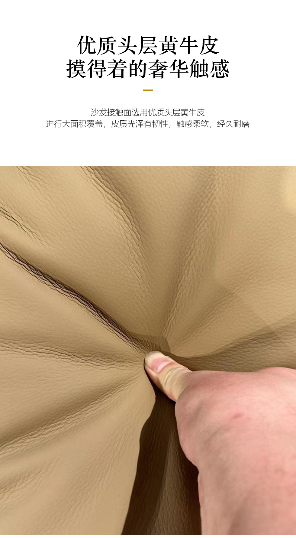 非凡工艺 现代简约 接触面头层黄牛皮+仿皮 E1级夹板+松木框架 无粉海绵 座包35D高回弹海绵 靠背公仔棉+羽绒填充 样色 直排2.8米大三人位 皮艺沙发