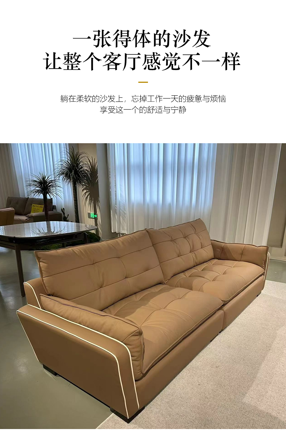 B系优选 奶油风 接触面头层黄牛皮+仿皮 E1级夹板+松木框架 无粉高密度海绵 靠包、扶手包填充羽绒+公仔棉 样色 直排2.8米大三人位 皮艺沙发