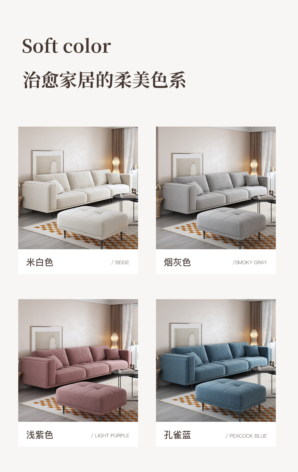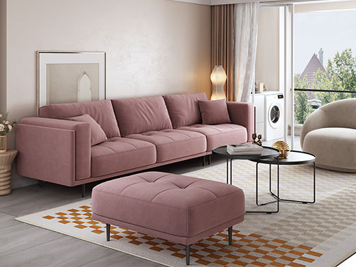 A系优选 现代简约 科技绒布料+抛光实木内架+合成板材框架+靠包填充优质A+公仔棉+坐包填充高密度纯海绵+15公分喷涂五金脚 浅紫色 2.73米四人位+脚踏