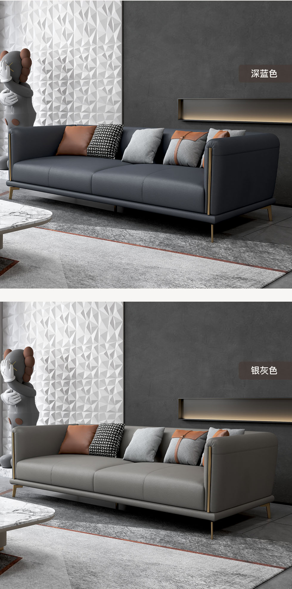 非凡工艺 现代简约 人体接触面优质超纤皮+其余位置仿皮 +抛光实木内架(桉木为主)+合成板材框架+坐包填充高密度纯海绵+15公分五金脚 深蓝 三人位 2.15米沙发