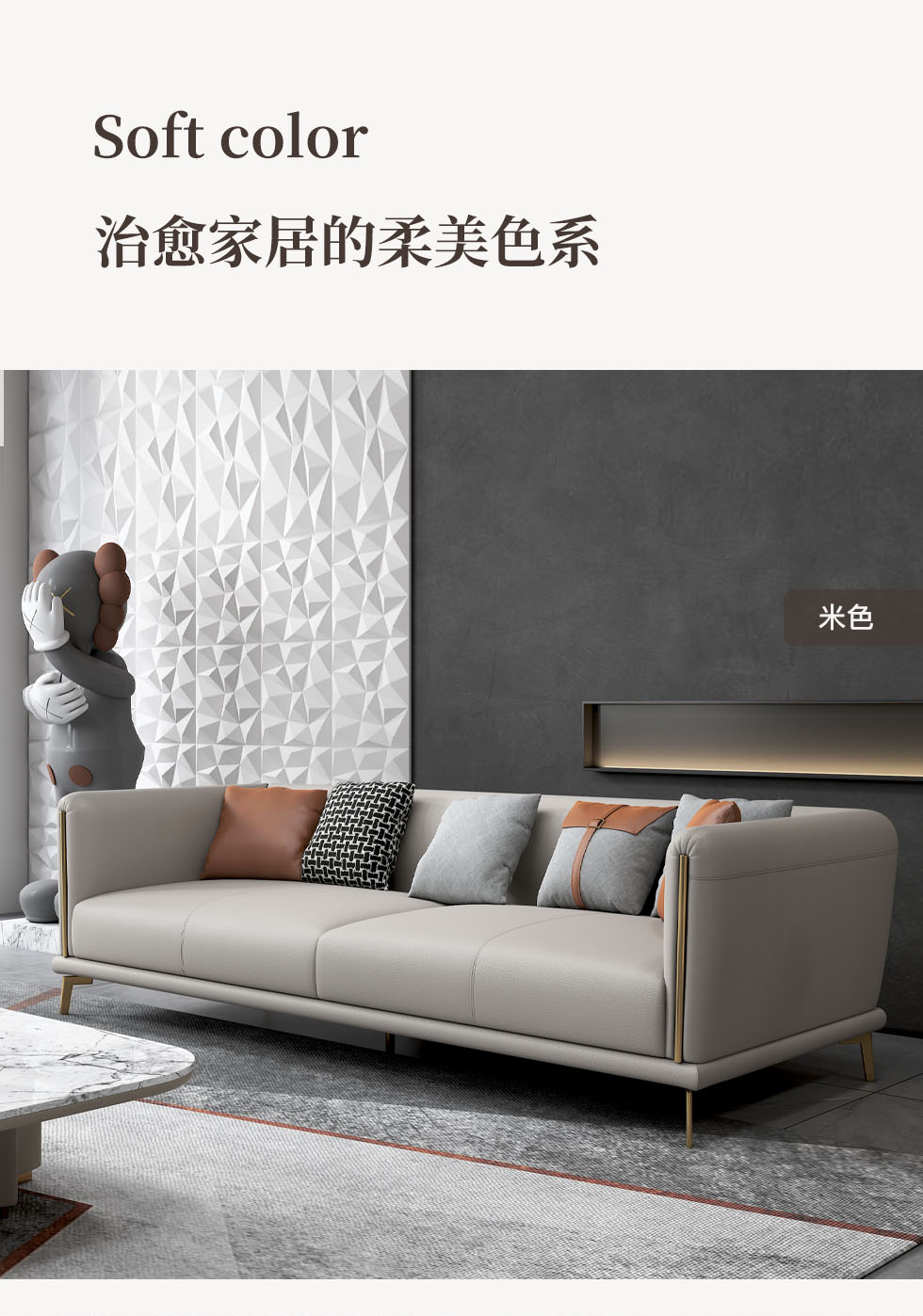非凡工艺 现代简约 北欧 接触面优质仿真皮革+仿皮+靠包,抱枕婴儿绒布防水,防污填充公仔棉+抛光实木内架(桉木为主)+合成板材框架+蛇形弹簧+定位平衡网格布+绿色高弹力橡筋+坐包填充高密度纯海绵+15公分五金脚 橙色 +米黄 三位 2.1米