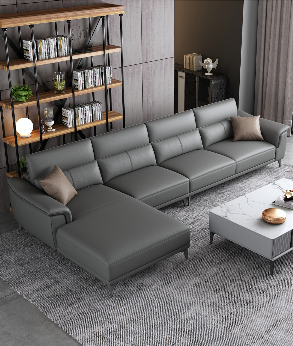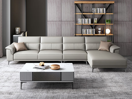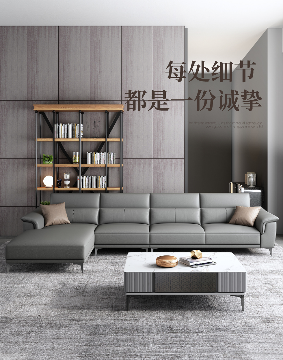 A系优选 现代简约 接触面超纤皮革+其余仿皮+抛光实木内架(桉木为主)+合成板材框架 +坐包填充高密度纯海绵 +12分五金脚 浅灰色 单位+左贵妃+三位 3.53米转角沙发