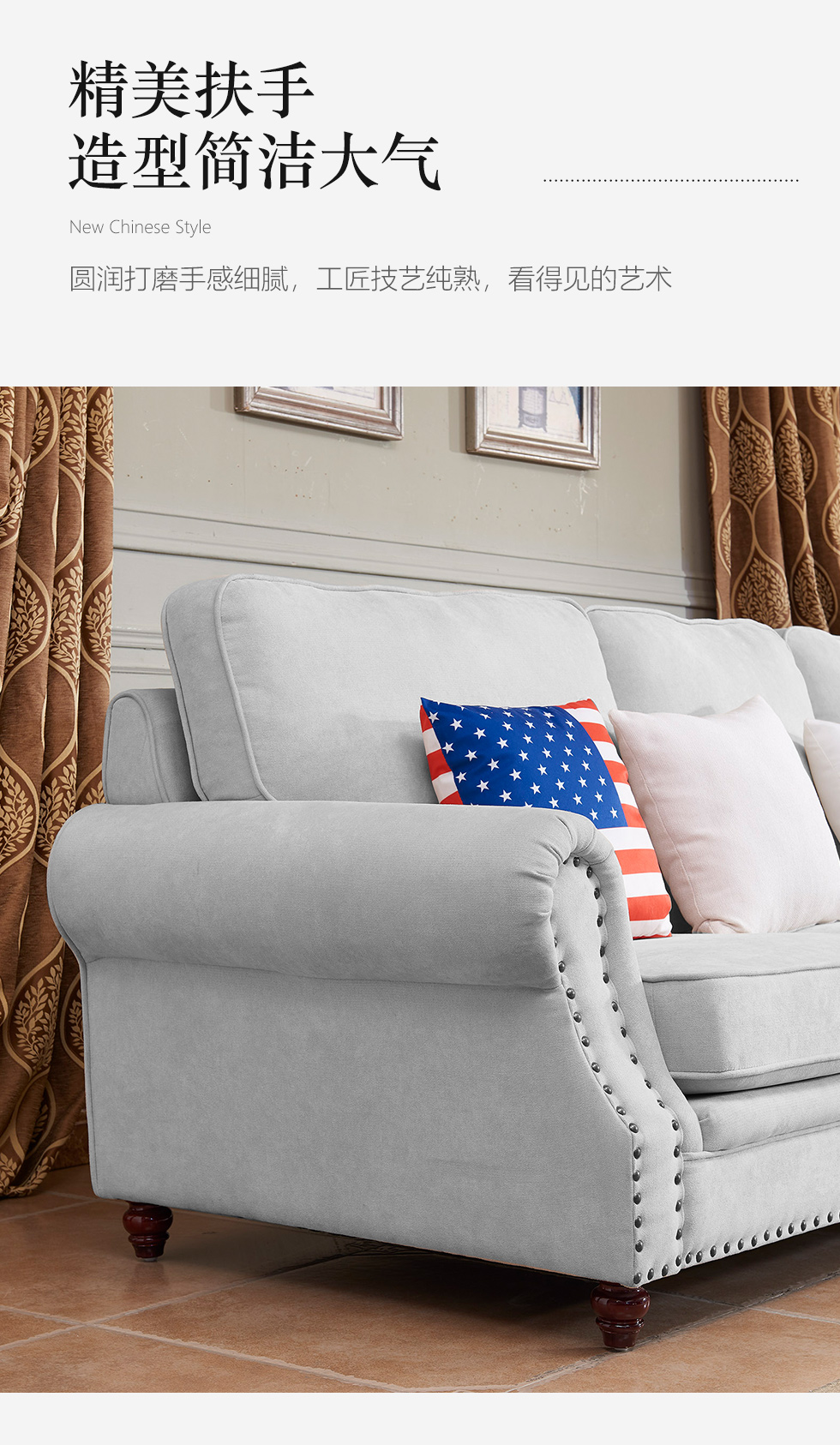 艾美侈 美式 俄罗斯桦木+棉麻布 珍珠银 三人位2.27米沙发¥16016