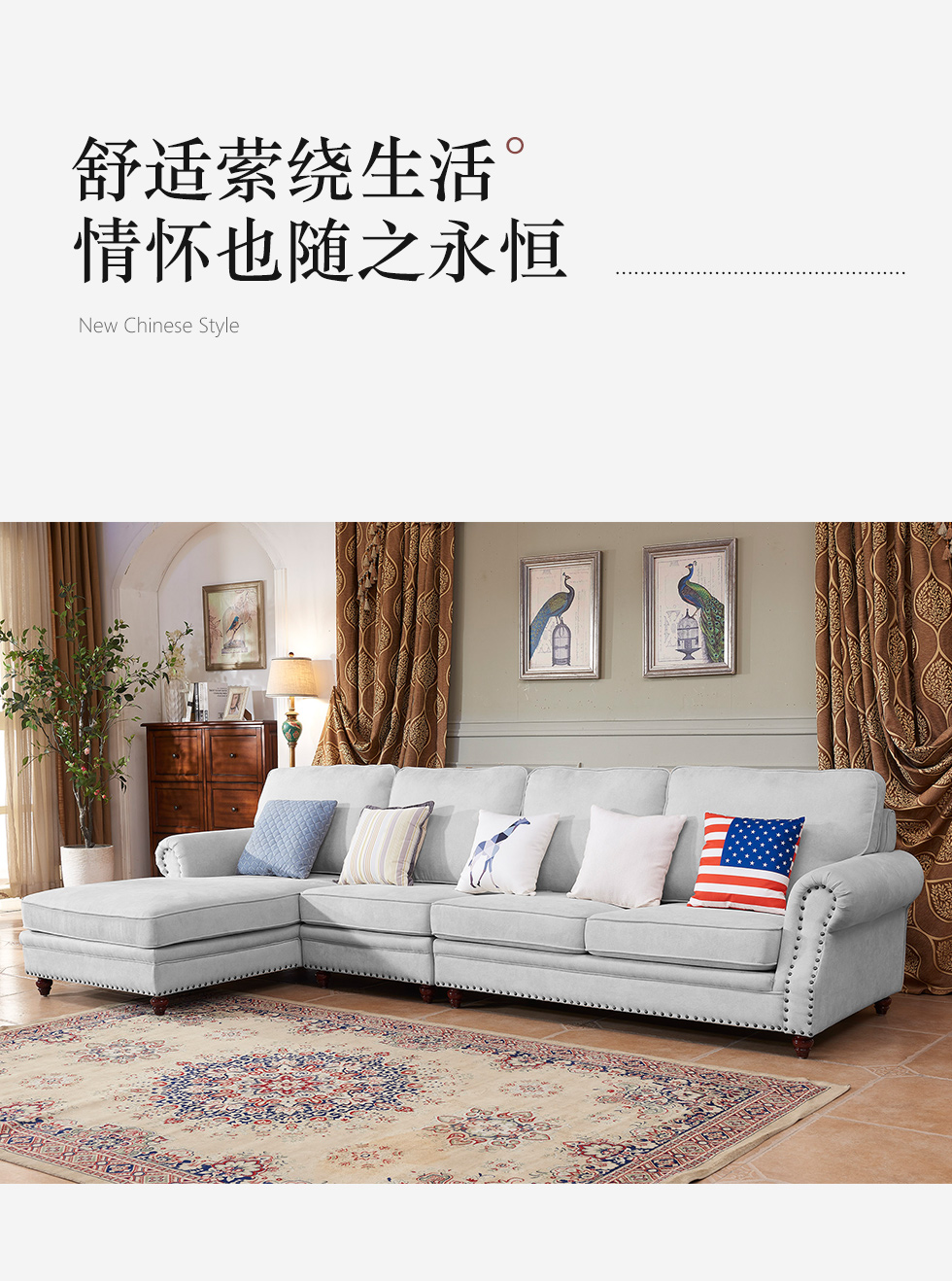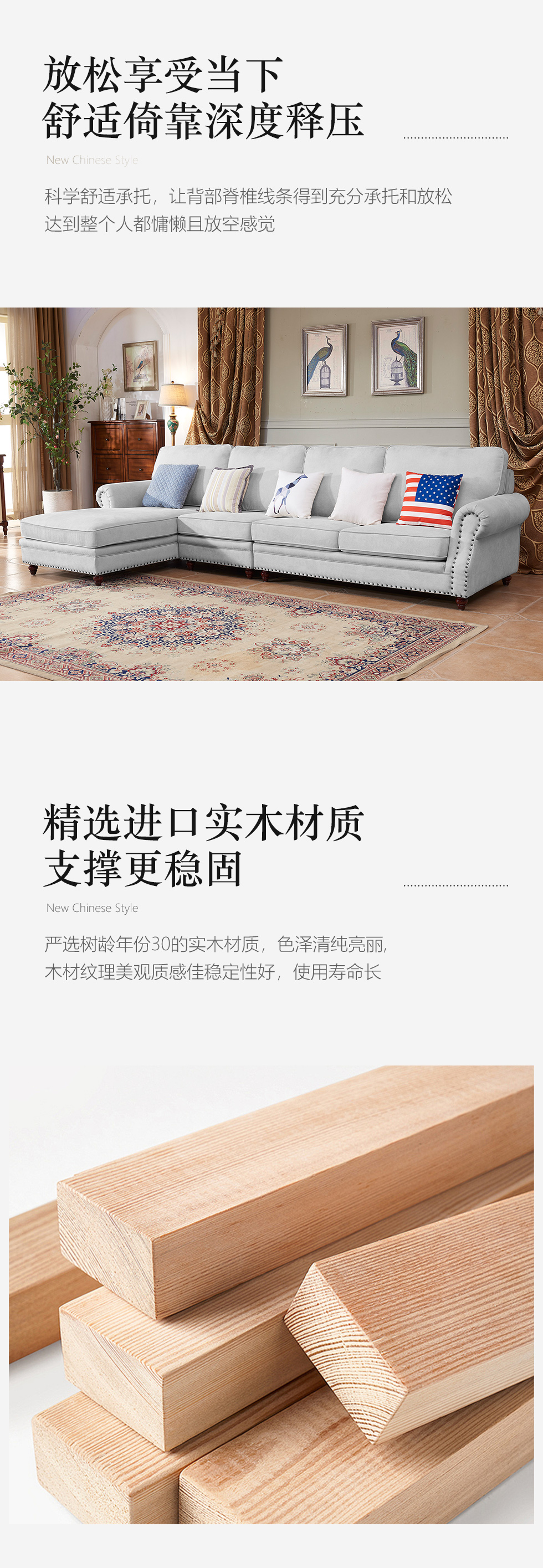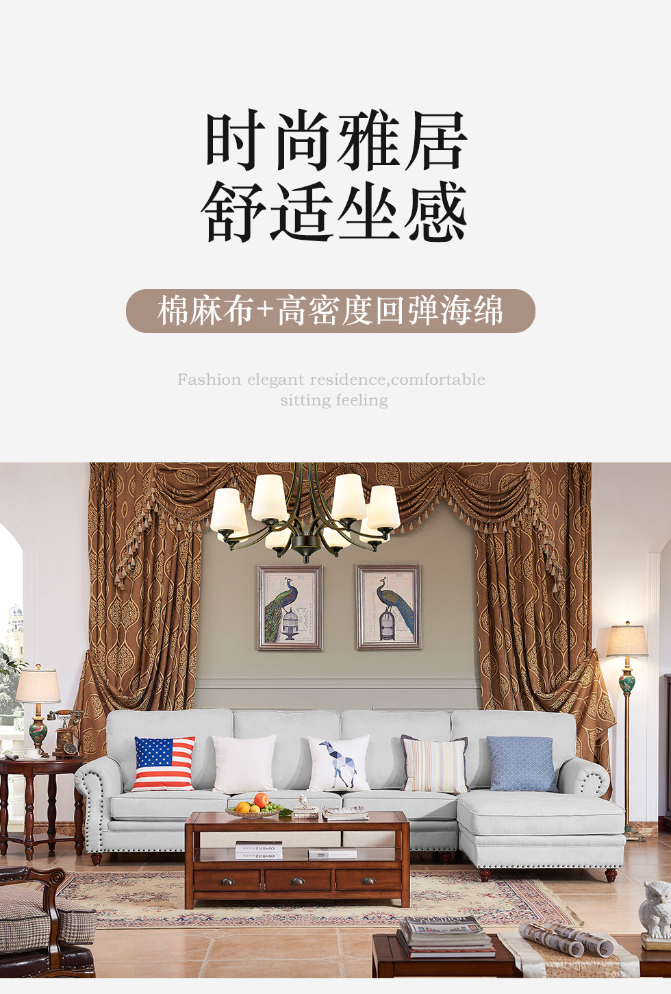 多纳宝 美式 美式 棉麻布+高密度回弹海绵+进口实木 1+3+右贵妃 转角3.42米沙发