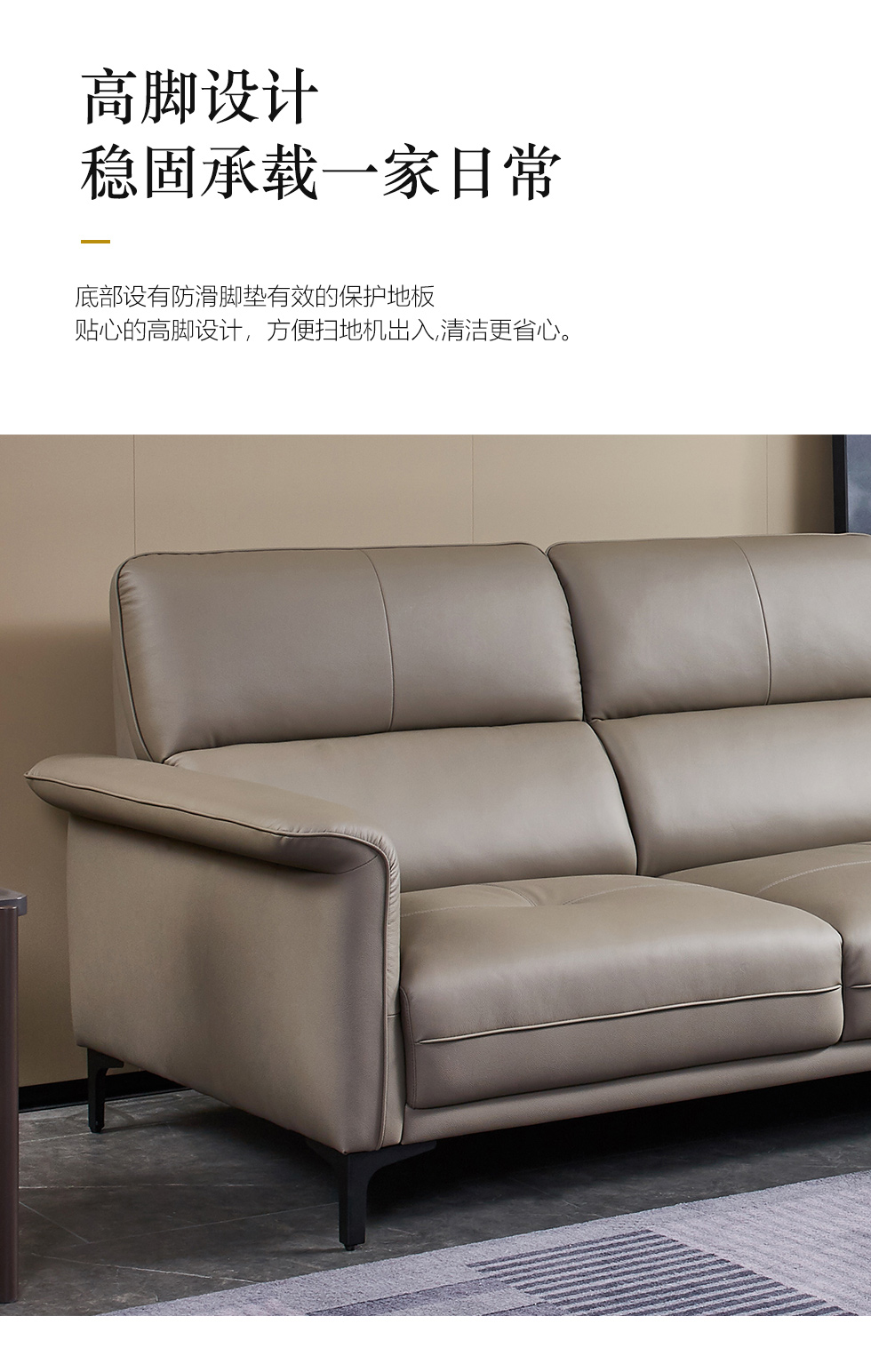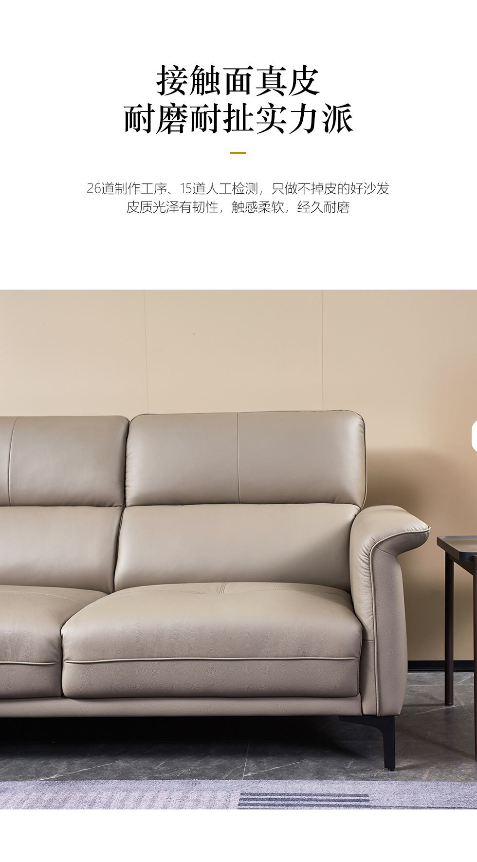 CBD家居 现代简约 接触面真皮+非接触面仿皮+超弹海绵+云杉木实木主框架+五金脚+靠包头枕可调节 三人位+脚踏 2.63米沙发