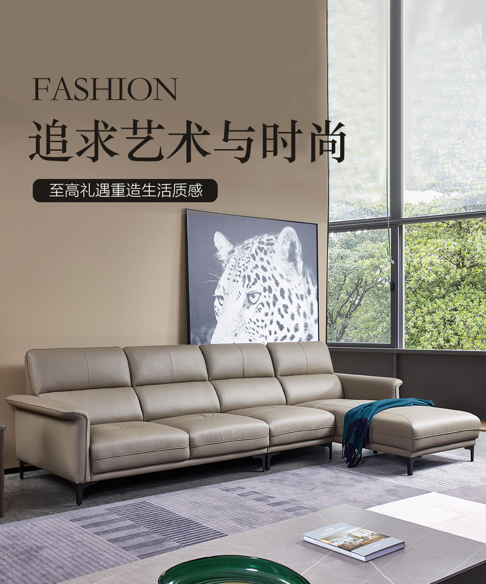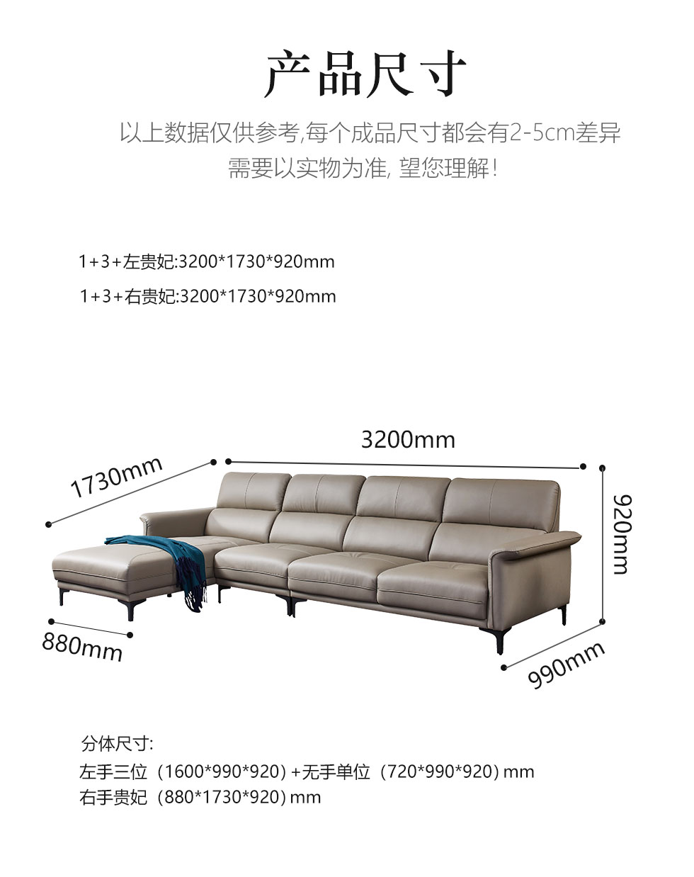 CBD家居 现代简约 接触面真皮+非接触面仿皮+东亚海绵+云杉木实木主框架 TE10燕羽灰 1+3+左手贵妃 转角3.2米沙发 |