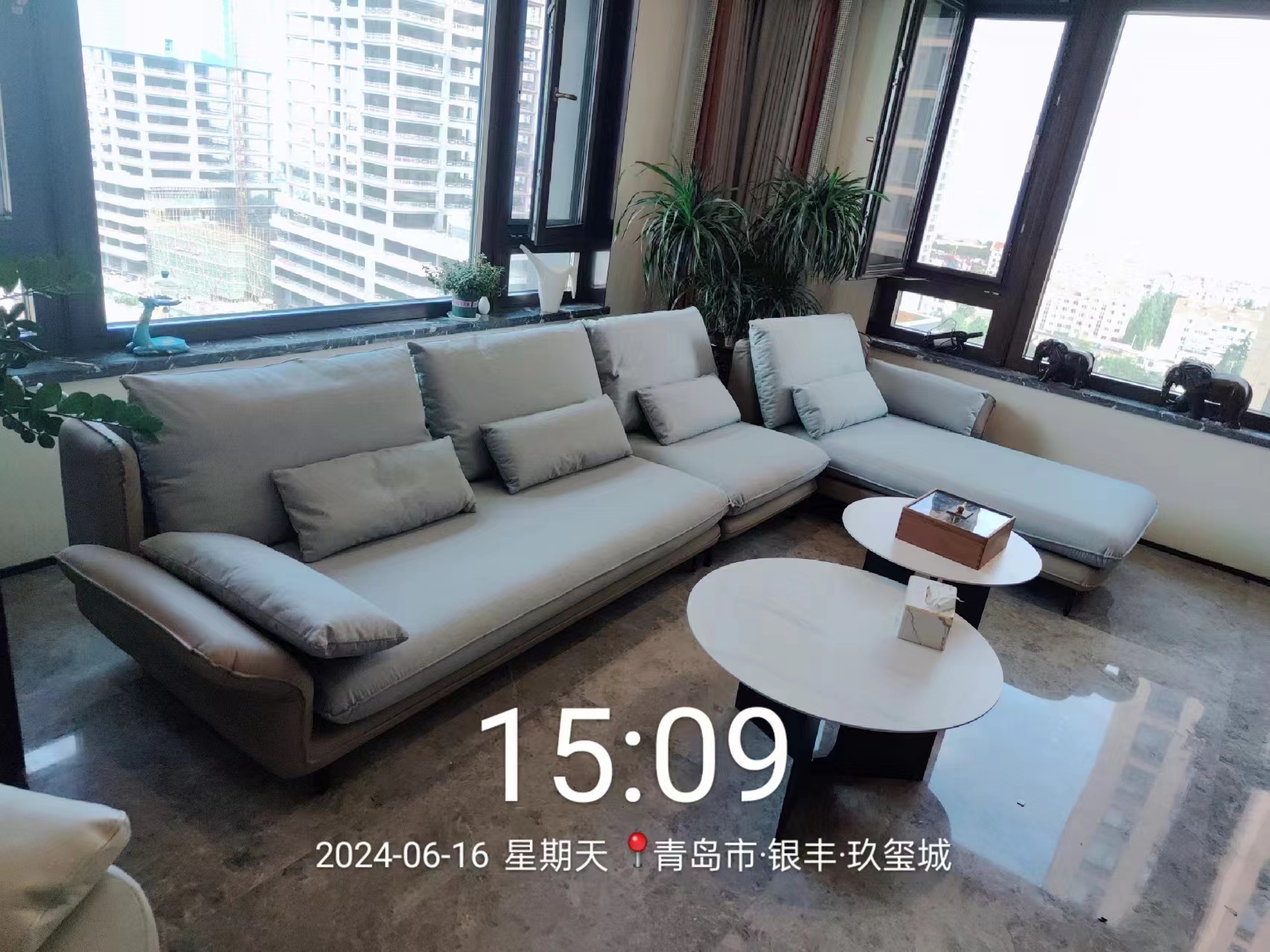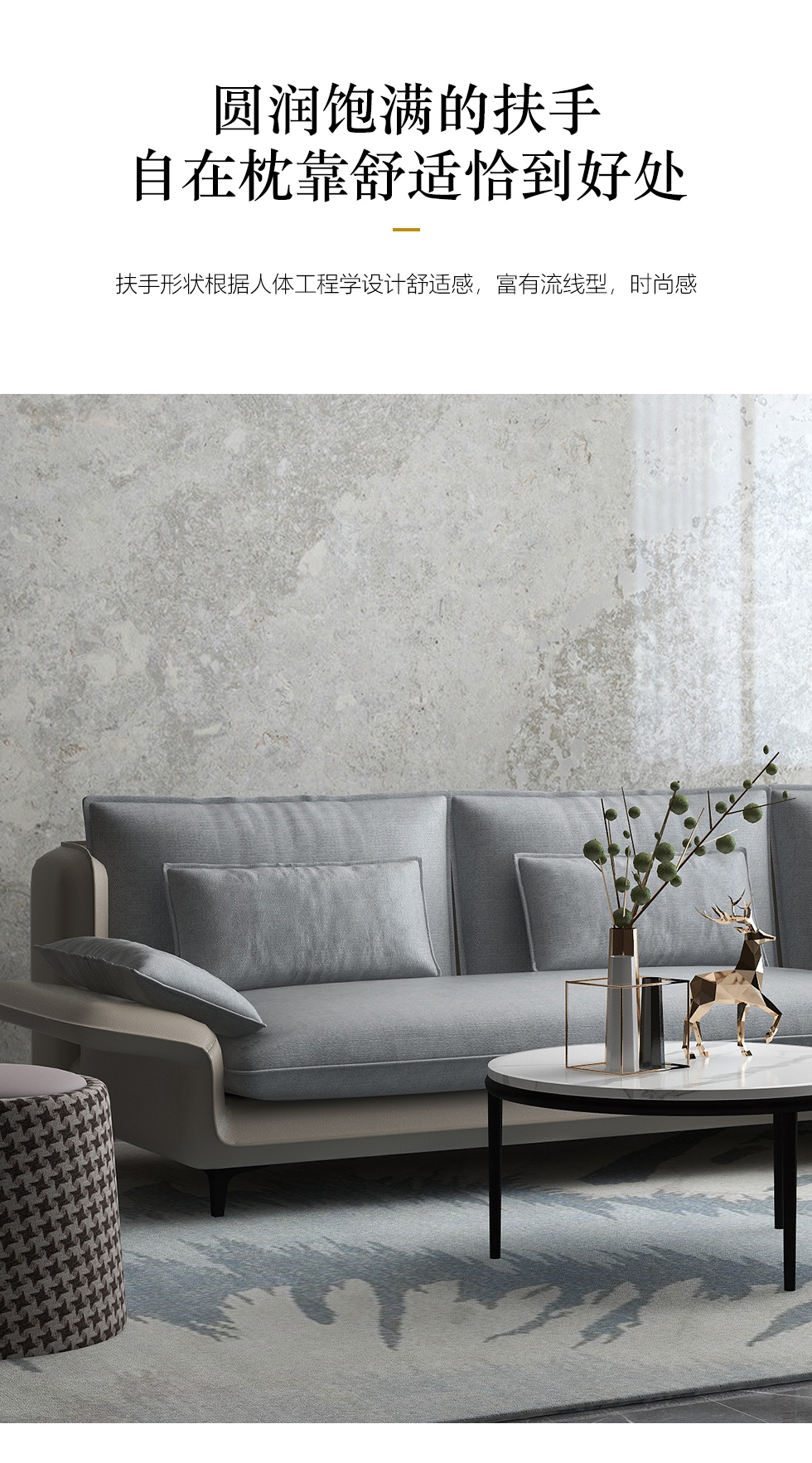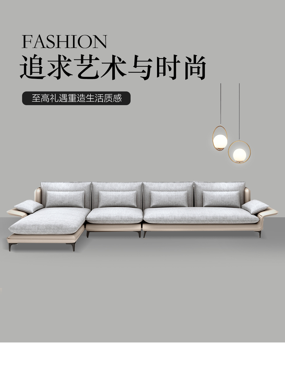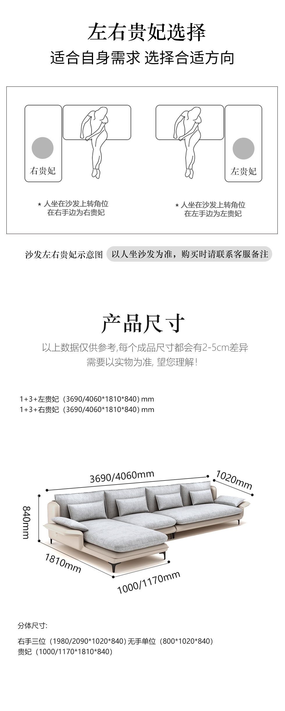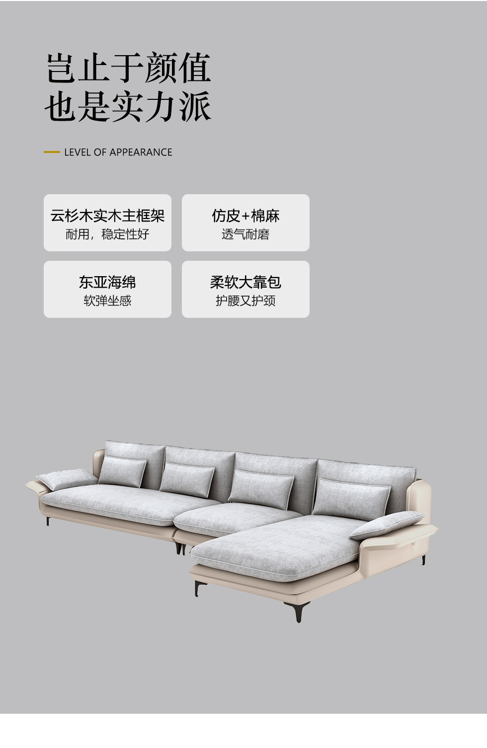 CBD家居 现代简约 外框TE13仿皮+内E029棉麻+东亚海绵+云杉木实木主框架 外框TE13雁灰内E029星辰灰 1+3+左手贵妃 转角4.06米沙发 |