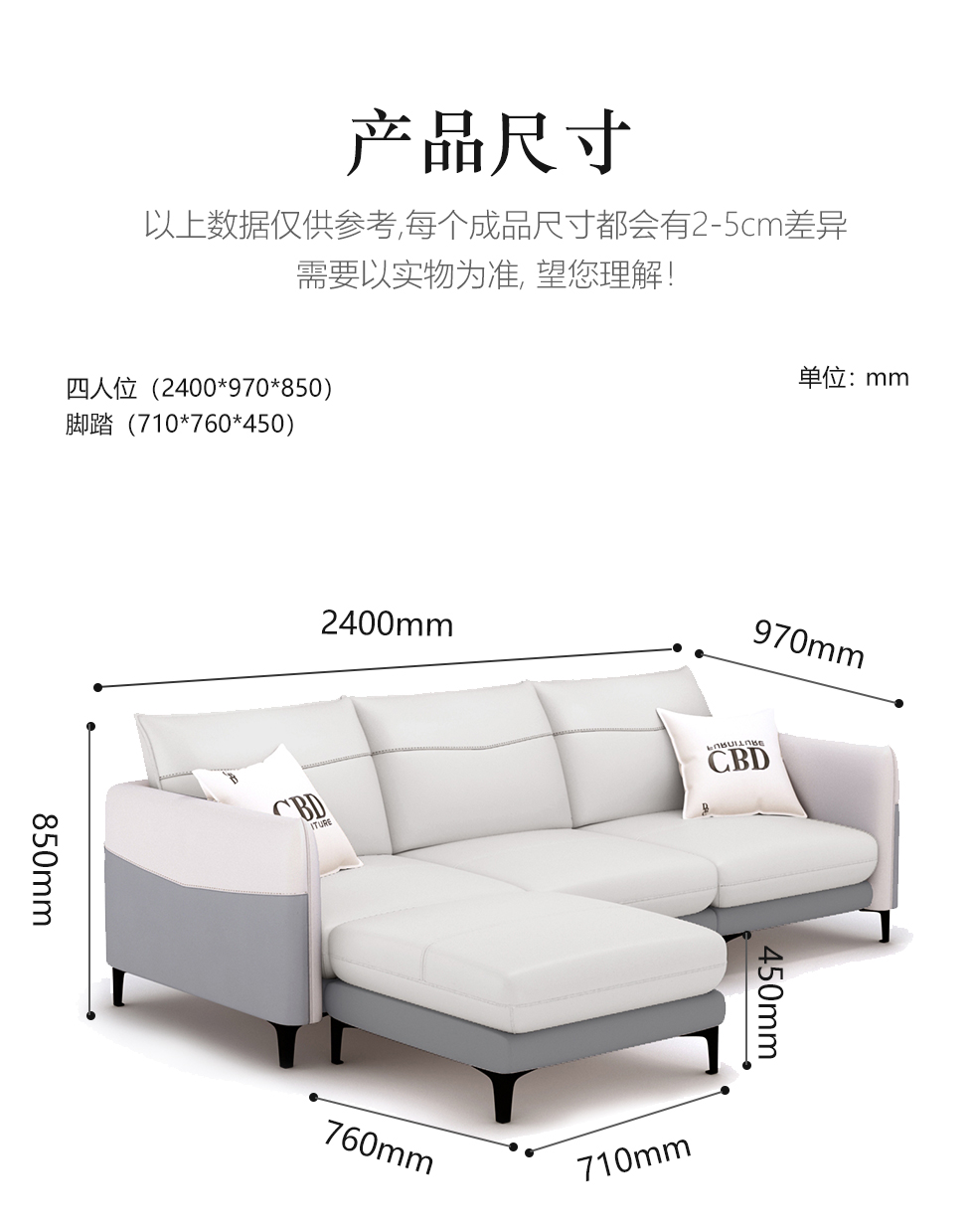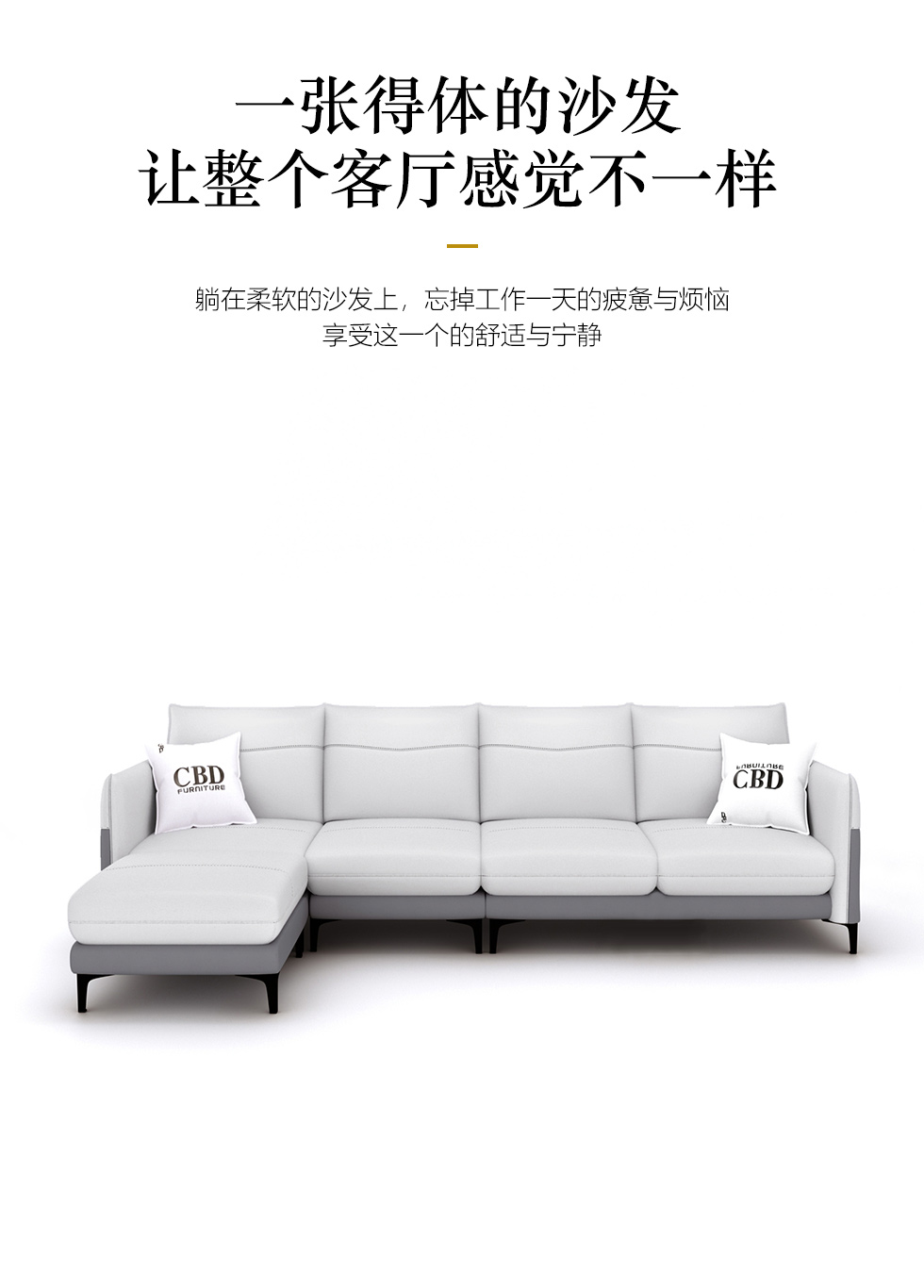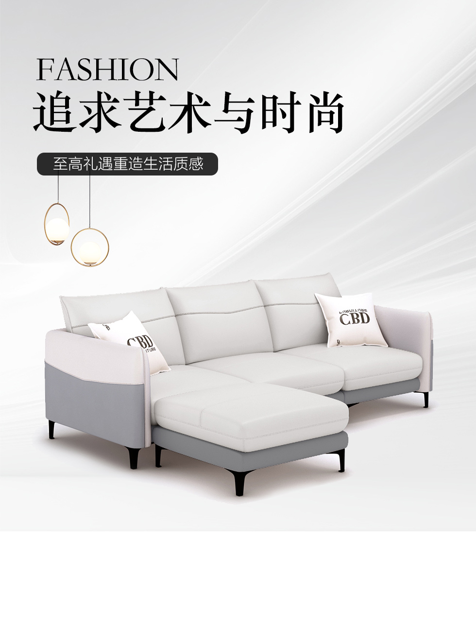 CBD家居 现代简约 优质纳纤皮+东亚海绵+云杉木实木主框架 主色HE12洁白辅色HE01高级灰 四人位+脚踏组合 沙发 |