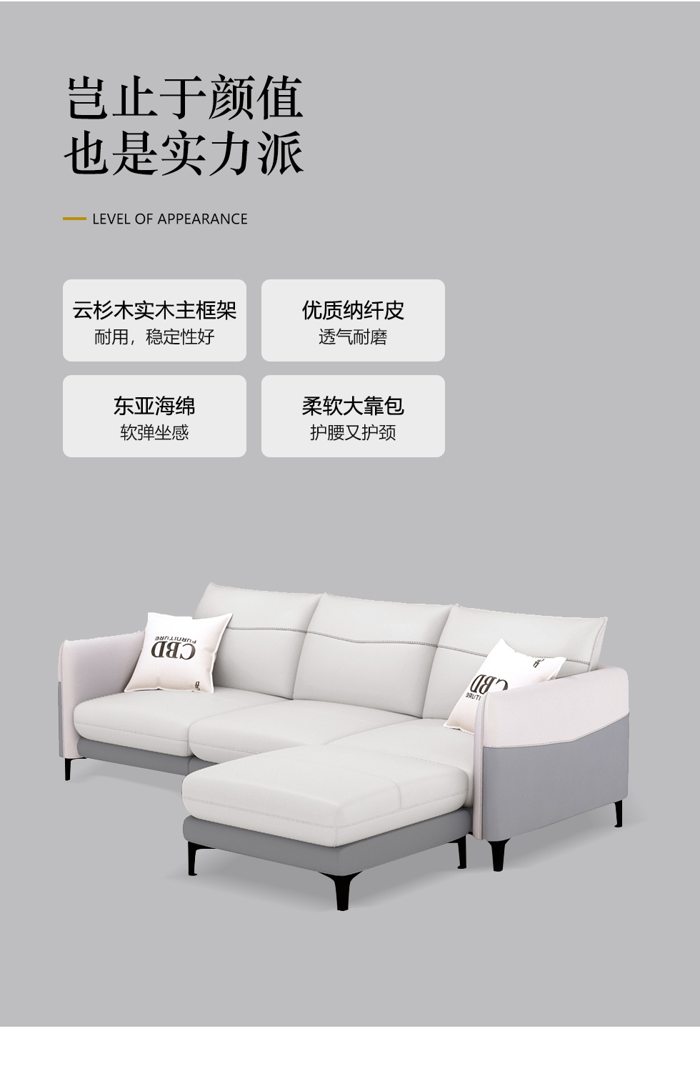 CBD家居 现代简约 优质纳纤皮+东亚海绵+云杉木实木主框架 主色HE12洁白辅色HE01高级灰 四人位+脚踏组合 沙发
