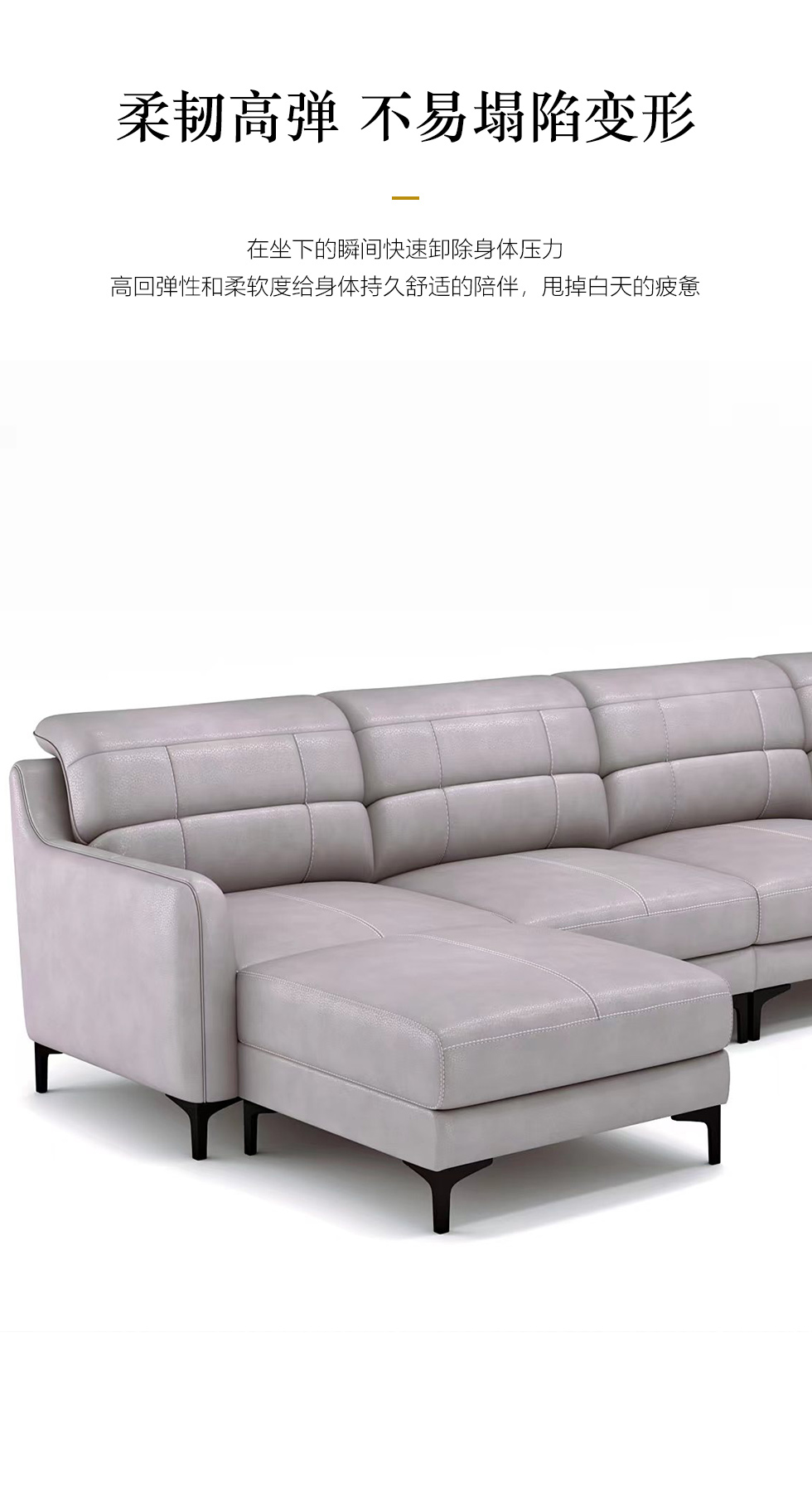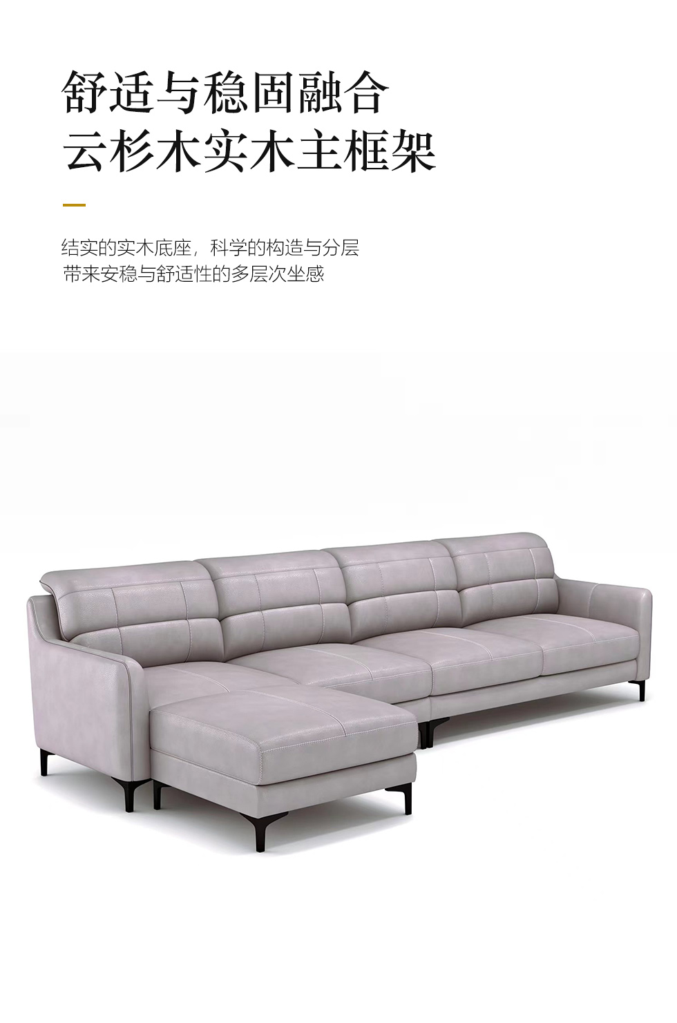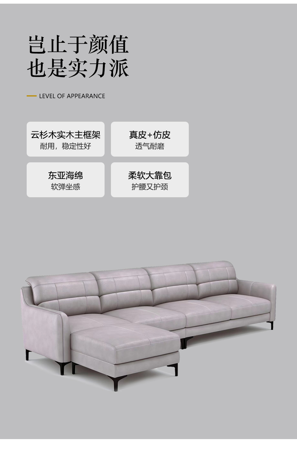 CBD家居 现代简约 接触面真皮+非接触面仿皮+超弹海绵+云杉木实木主框架+五金脚 三人位+脚踏 2.83米沙发