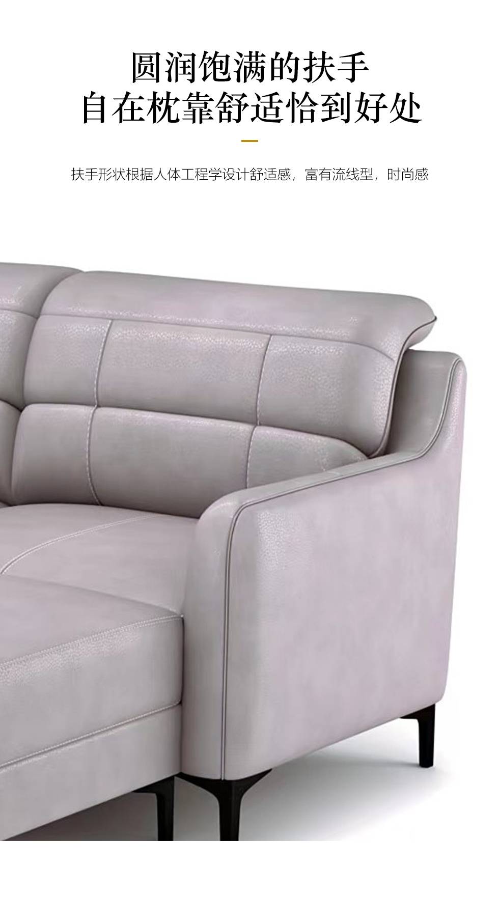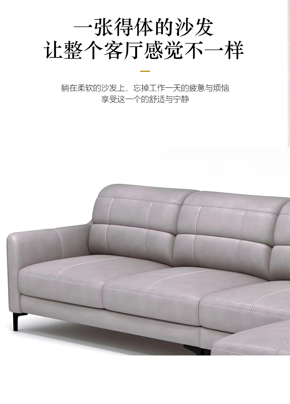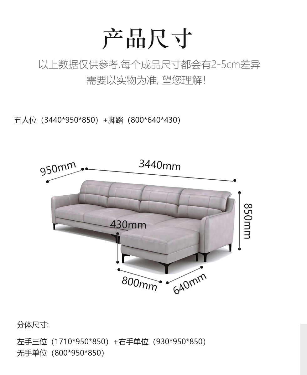 CBD家居 现代简约 接触面真皮+非接触面仿皮+超弹海绵+云杉木实木主框架+五金脚 三人位+脚踏 2.83米沙发