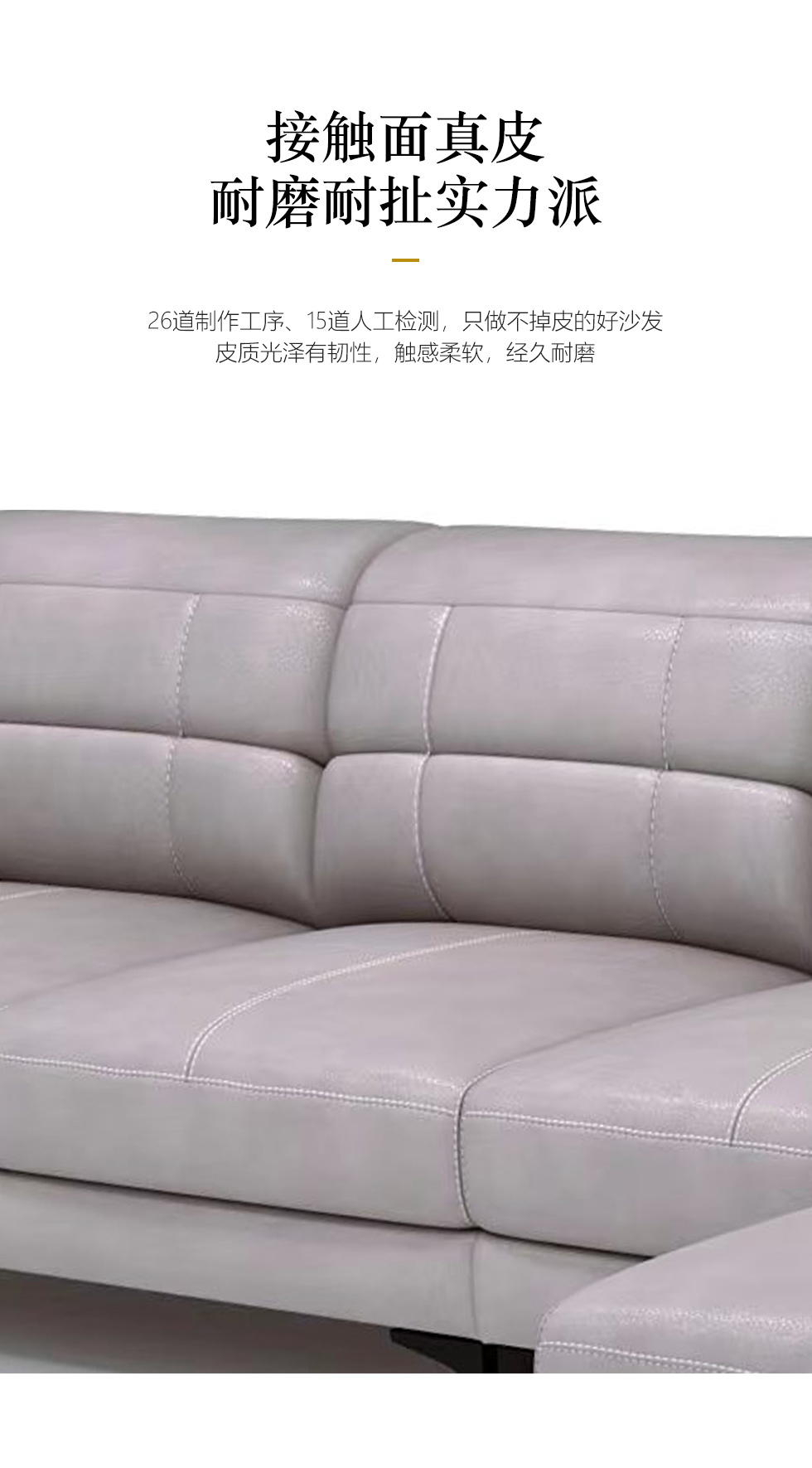 CBD家居 现代简约 接触面真皮+非接触面仿皮+超弹海绵+云杉木实木主框架+五金脚+靠包头枕可调节 三人位+脚踏 2.63米沙发